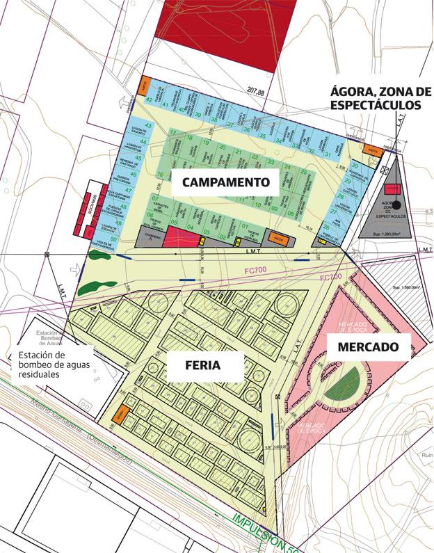 El área de Infraestructuras, que gestiona Diego Ortega, ha levantado un estudio topográfico nuevo y detallado del terreno, que tiene un montículo hacia la zona Este y una línea eléctrica. Lo que sí está claro es que el recinto ocuparía unos 58.000 metros, con la superficie dividida a partes iguales para campamento y feria. El mercado ocuparía entre 7.000 y 9.000 metros y la zona de espectáculos entre 1.300 y 2.330. El vallado perimetral superará los mil metros de longitud.