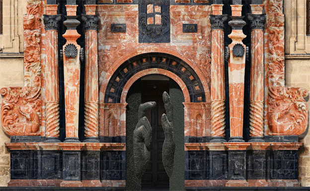 El escultor barcelonés proyecta para el acceso principal las manos de un Cristo Bendiciente: «Es una invitación a entrar, no rechazan ni escogen, nos unen en su espiritualidad. Al abrirse, la mano esculpida se expande convirtiéndose en el Cristo de amor generoso que protege y abraza a toda la Humanidad»