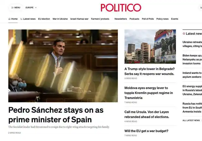 Político, el diario más influyente entre las élites europeas de Bruselas, ha abierto su edición digital con: ‘Pedro Sánchez sigue como primer ministro. El líder socialista había amenazado con dimitir por los ataques de la extrema derecha contra su familia’.