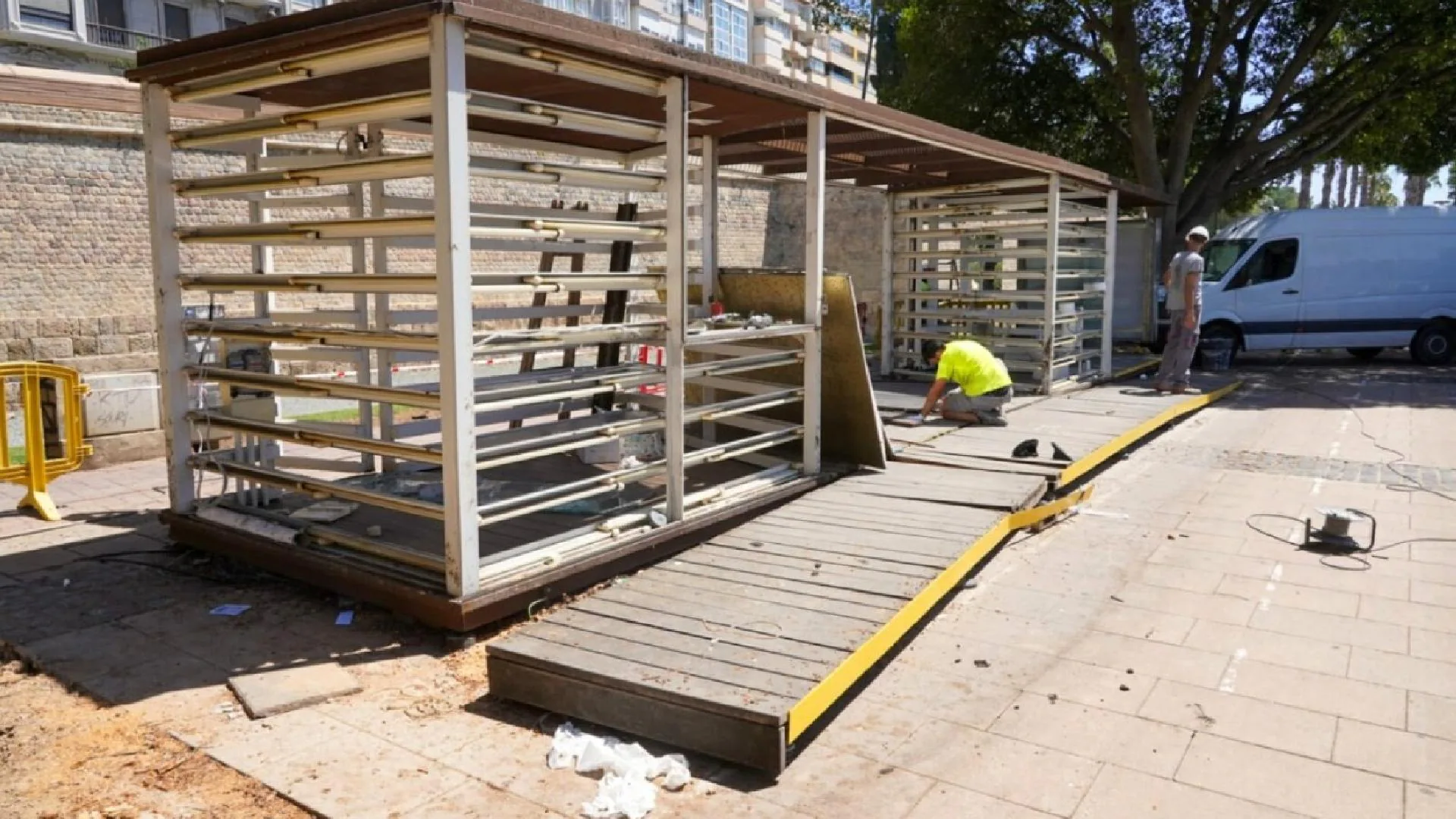 El Área de Infraestructuras del Ayuntamiento de Cartagena ha retirado la oficina turística del Muelle de Alfonso XII, que sufrió daños estructurales por el vuelco de uno de los grandes ficus, tras los episodios de lluvias y fuertes vientos de mediados de junio. Será reemplazada por una instalación temporal de Puerto de Culturas, que estará abierta al público antes de que termine este mes de julio.
