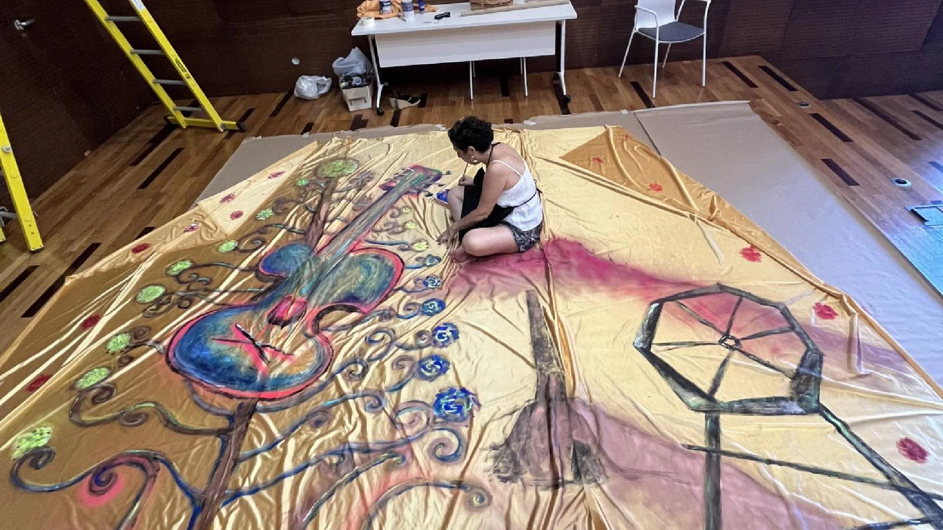La artista ha trabajado estos meses para decorar la portada, las barras, las sillas y mesas del establecimiento. El espacio tendrá tres columnas turquesas con motivos rosas de dos metros y medio de altura, tres arcos gigantes macizos donde aparece «el nombre de ‘Café Cantante’ muy lujoso, con una serie de telas que van adornando como si fuese la época de los 1900 más pomposa y lujosa de los cafés», explica. Alrededor de todo el espacio aparecerán varios elementos donde la artista homenajea a Asensio Sáez con su estilo propio y anuncios antiguos. Este espacio, que acogerá este año varias ‘madrugás’ flamencas durante el festival, también lucirá telas, imitando un escenario del modernismo con mantones de manila, y colores siguiendo la misma temática de la fachada y de las barras. Para Antonia Esther, decorar el Café Cantante es ver cumplidos sus sueños, esperando ver en este trabajo el Café Cantante que ella conoce, esperando que sea «un referente dentro de la plaza Joaquín Costa».
