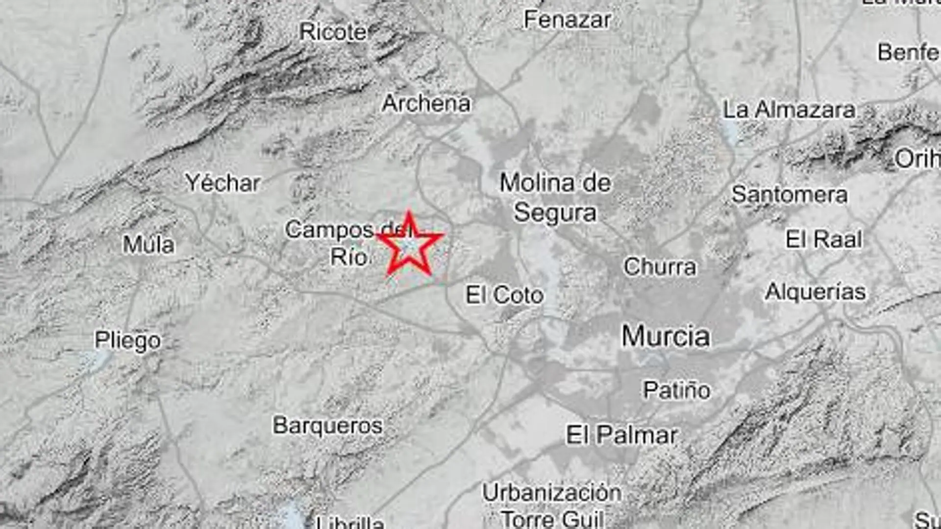 Día de movimientos sísmicos este jueves en la Región de Murcia. Según el Instituto Geográfico Nacional (IGN), en la Comunidad se registraron cuatro terremotos a lo largo de la jornada. El último de ellos tuvo su epicentro en Campos del Río a cinco kilómetros de profundidad. Se produjo a las 20.38 horas y contó con una magnitud de 2,8 grados en la escala de Richter. Según el IGN, también se percibió el temblor en las localidades de Archena, Las Torres de Cotillas, Alcantarilla, Ceutí, Villanueva del Río Segura y Molina.