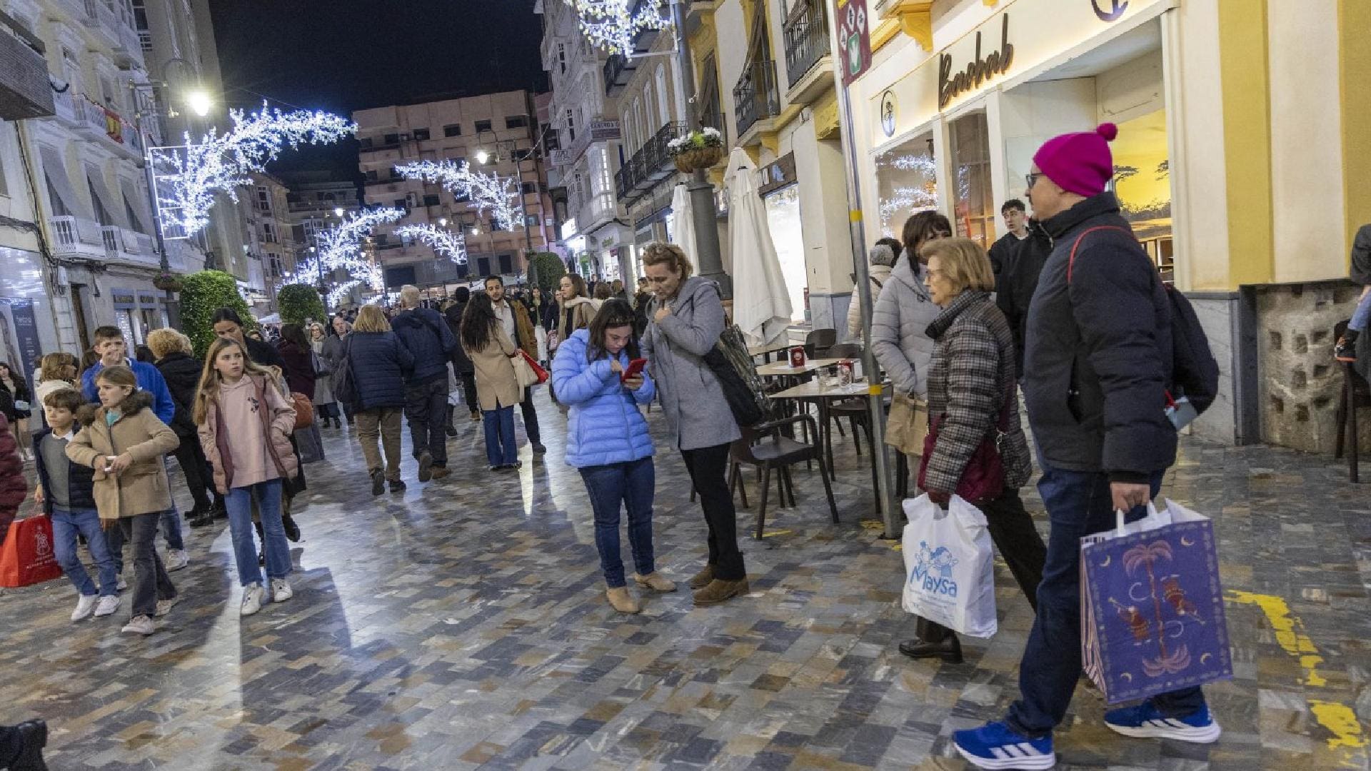 «Me he comprado un abrigo que me ha gustado y me han dado una papeleta con la que participo en un sorteo de regalos. A ver si me toca». Ángeles Palazón fue una de los muchos clientes que este viernes, animados por la ‘I Shopping Night Cartagena da la nota’, acudieron a los comercios del centro a comprar. Lo hizo en una tarde en la que se encontró, además de la alegría de las fiestas navideñas, música, un desfile de moda, un concurso, un espectáculo de magia y juegos en la calle.