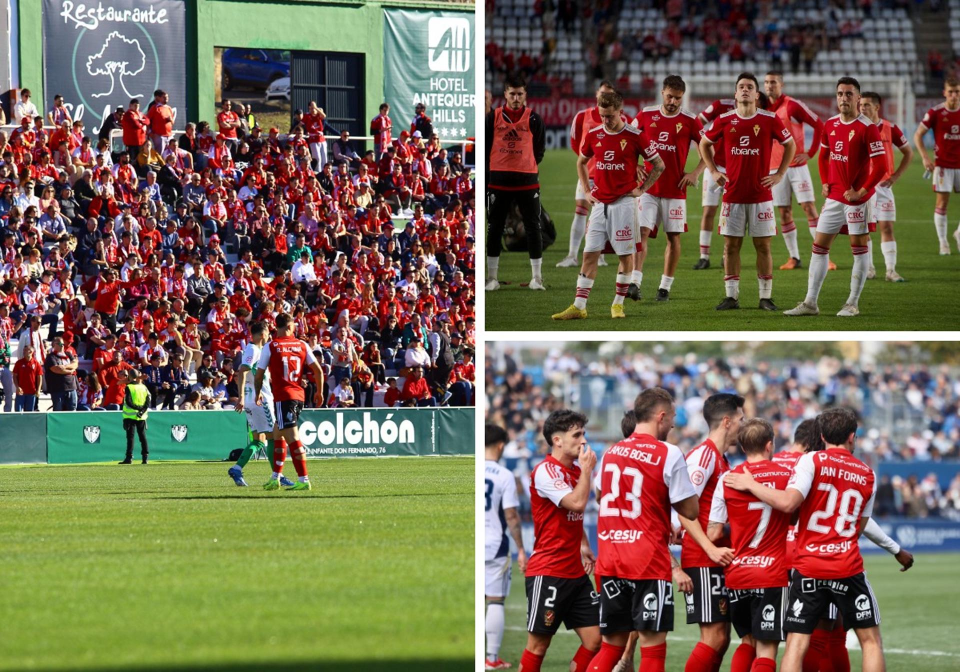 Los 800 fieles granas que acudieron a Antequera en enero. Los jugadores granas, tras caer frente al Eldense en mayo de 2023. El Murcia celebra un gol ante el Marbella (1-4) el pasado 9 de febrero.
