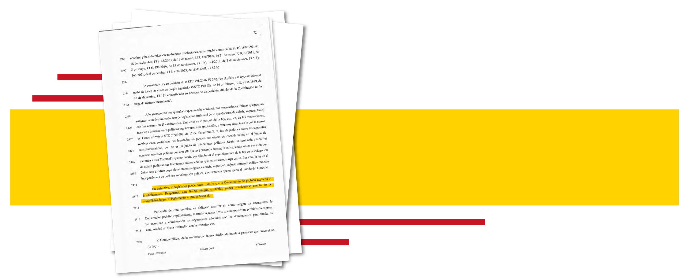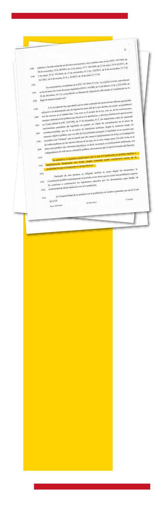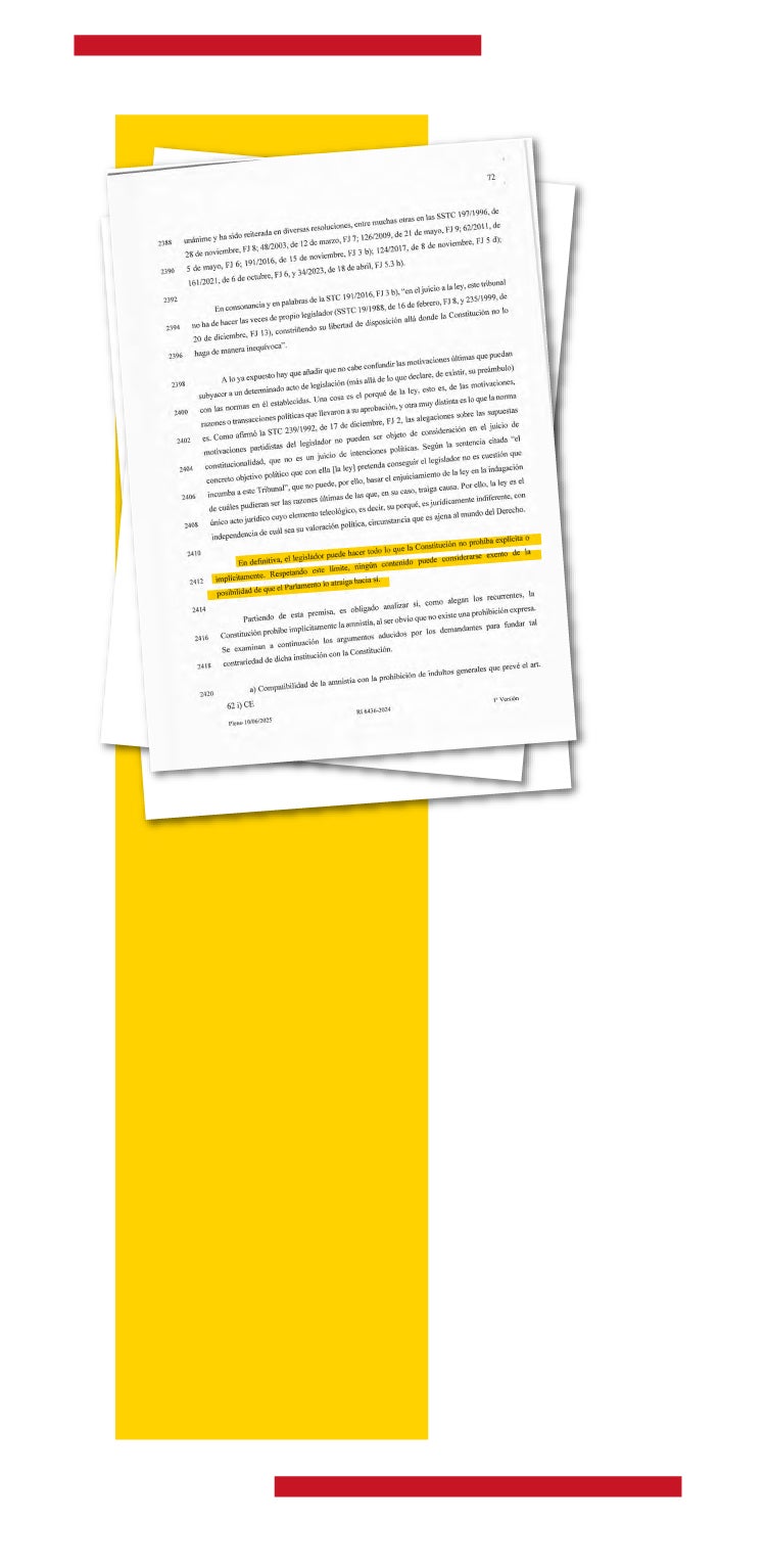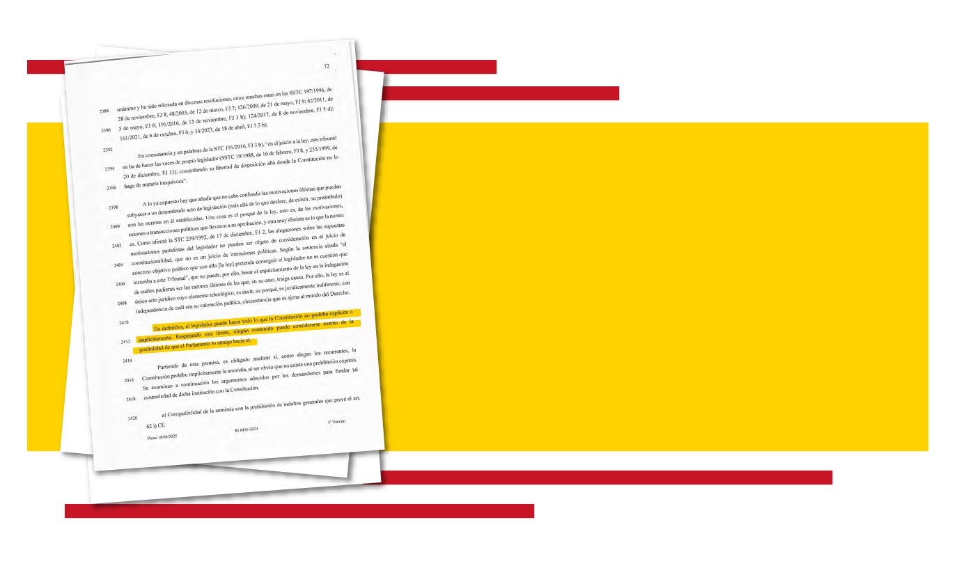 «El legislador puede hacer todo lo que la Constitución no prohíba explícita o implícitamente», concluye con rotundidad ese documento que bendice la inmensa mayoría del texto de la Ley Orgánica 1/2024, de 10 de junio, ‘de amnistía para la normalización institucional, política y social en Cataluña’. La corte solo da la razón al PP en tres aspectos, bastantes secundarios, de su demanda: en que vulnera el principio de igualdad por no amnistiar los actos contrarios al procés; en su falta de concreción temporal de los hechos a cancelar y en la necesidad de oír a las partes en el Tribunal de Cuentas.