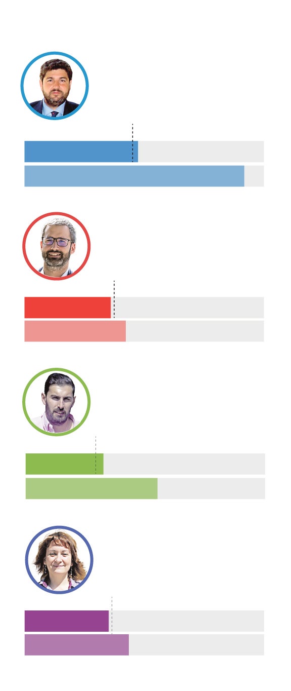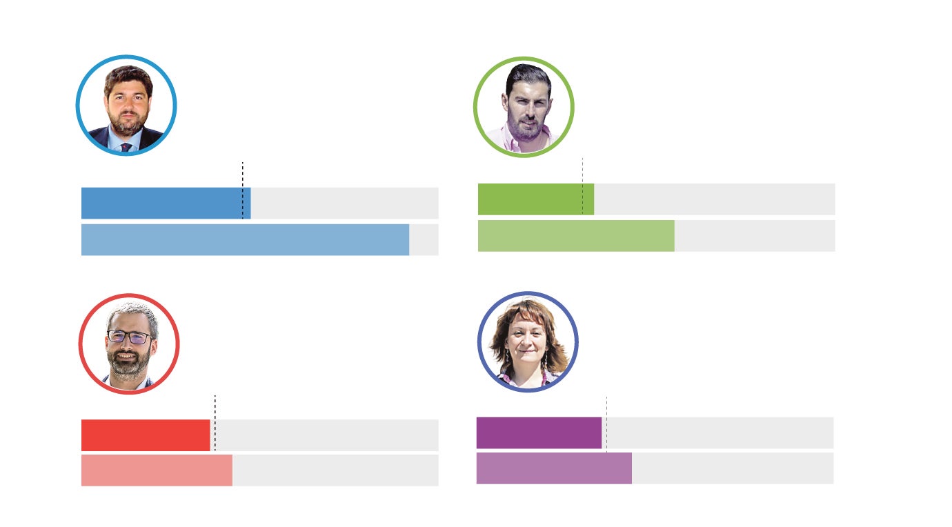 En cuanto a líderes, el presidente de la Comunidad, Fernando López Miras, es el más conocido y mejor valorado, aunque no consigue el aprobado. El jefe del Ejecutivo presenta un grado de conocimiento por parte de la ciudadanía del 91,9%, con una puntuación media de 4,8. Entre sus votantes, la nota del jefe del Ejecutivo regional sube hasta el 6,6 (más que Feijóo), consiguiendo también el aprobado entre los encuestados más jóvenes.