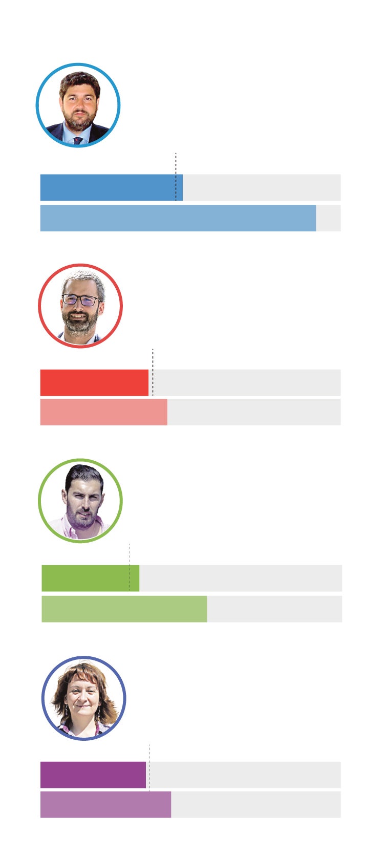 El Partido Popular volvería a ganar las elecciones autonómicas en la Región, pero el gran crecimiento de Vox, que se colocaría como segunda fuerza política al dar el ‘sorpasso’ al PSOE, le alejaría de su objetivo de la mayoría absoluta en 2027.