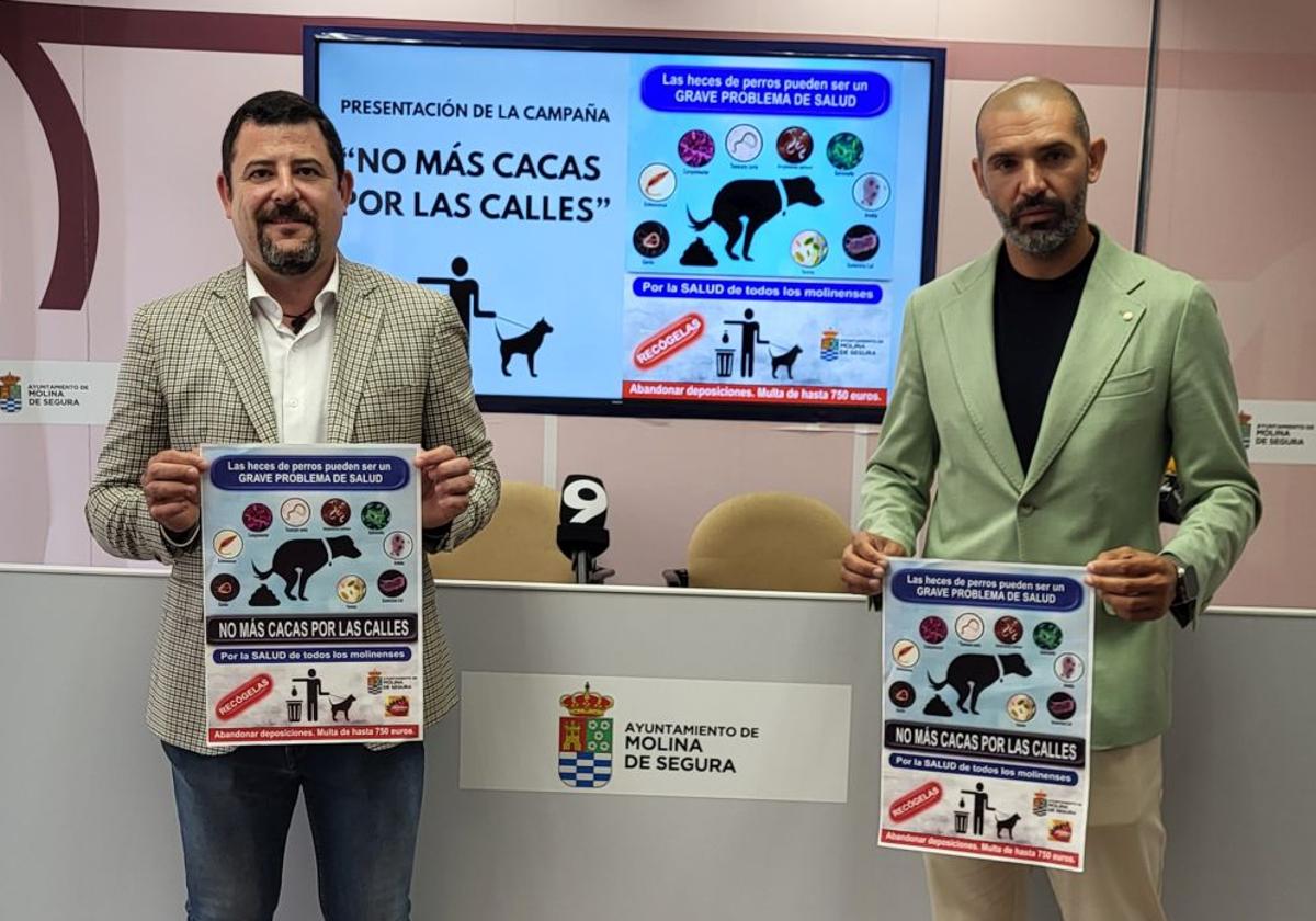 El Ayuntamiento de Molina de Segura, a través de la concejalías de Deporte y Salud y Policía Local, presenta la campaña ‘No más cacas por la calle’. Por la salud de todos los molinenses, con la que trata de concienciar a la ciudadanía del grave problema de salud que pueden suponer las heces de perro y la importancia de recogerlas y limpiar la zona afectada. La iniciativa ha sido presentada en rueda de prensa este martes por el edil de Deporte y Salud, Carlos Perelló, y el edil de Policía Local, Antonio Martínez.