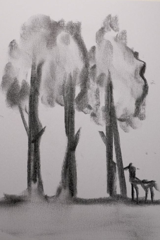 «He visto un gran dolor y necesitaba de alguna manera supurarlo». El propio artista viajó hasta Vigo para llevar alimentos a las poblaciones afectadas por este desastre ambiental. «Diez horas en mi furgoneta», recuerda para depositar el cargamento en Emaús Fundación Social, organización centrada en defender y acompañar a las personas más desfavorecidas de la sociedad. «A la vuelta a Mula paré en esos lugares arrasados, recogí los carbones y tomé conciencia de que algo tenía que hacer para contrarrestar ese dolor. Más de 10.000 árboles imaginarios para restaurar ese paisaje emocional y de la memoria».