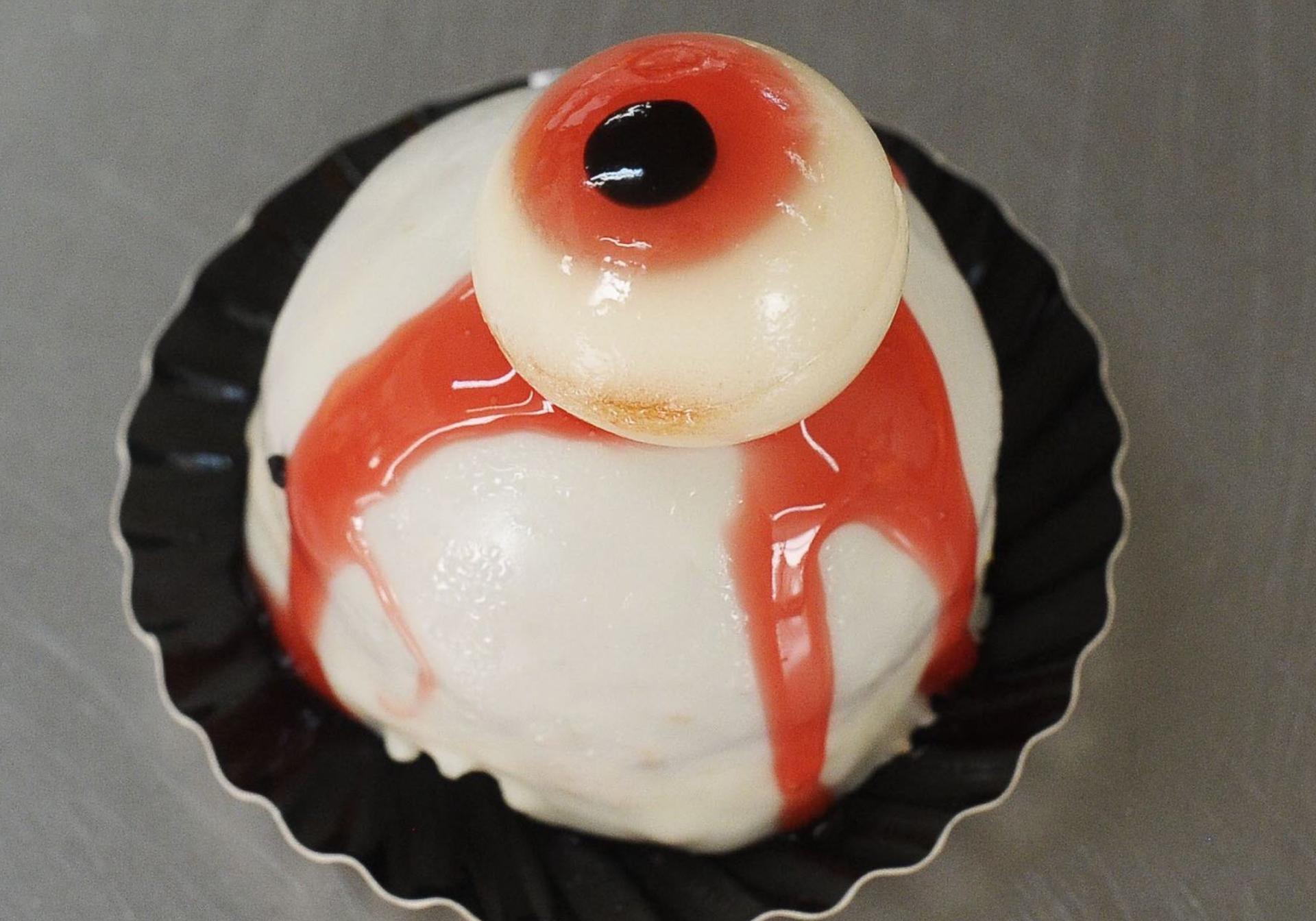 Los iris los haremos con la gelatina, para ello ponemos en un recipiente el agua caliente con un poco de colorante rojo y con la gelatina previamente hidratada. Lo metemos al frigorífico para que se enfríe. Cuando la gelatina se haya solidificado la cortamos en pequeños círculos y se los pegamos a nuestras bolitas con un poco de chocolate negro para dibujar la pupila. Si dejamos caer gotas de sirope de fresa alrededor del iris parecerá que nuestros ojos sangran.