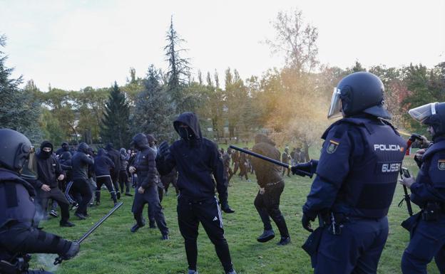 Después, en las inmediaciones del campus, en el barrio de Iturrama, cientos de encapuchados completamente vestidos de negro que se han afrentado contra otro medio centenar de jóvenes con alguna bandera de España poco antes de las siete de la tarde.