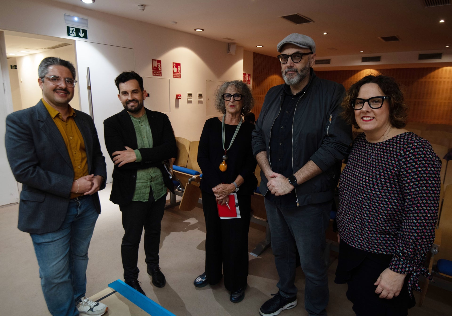 Jorge Ollero, Manuel Madrid, Lola López Mondéjar, Miguel Ángel Hernández y Ana Sánchez, durante el encuentro en el festival Lenguaraz, en el Museo de Bellas Artes de Murcia.