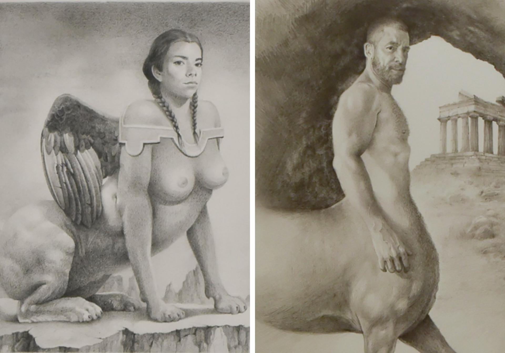 Dos obras entre la realidad, el mito y la ficción. A la izquierda, ‘La esfinge’. A la derecha el actor Raúl Tejón en la pieza titulada ‘Quirón en la cueva’, grafito sobre papel.