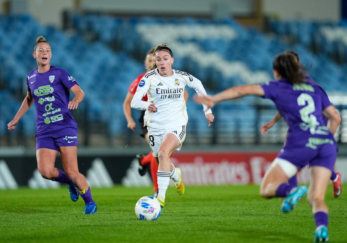 Solo cuatro minutos después, la neerlandesa Lotte Keukelaar demostró con una jugada brillante por qué el Real Madrid es uno de los mejores equipos del país y cuenta con una plantilla fabulosa. La delantera de 20 años volvió loca a Zumarraga, lateral del Alhama, a la que bailó en el área para disparar a portería y poner el tercero de la tarde.