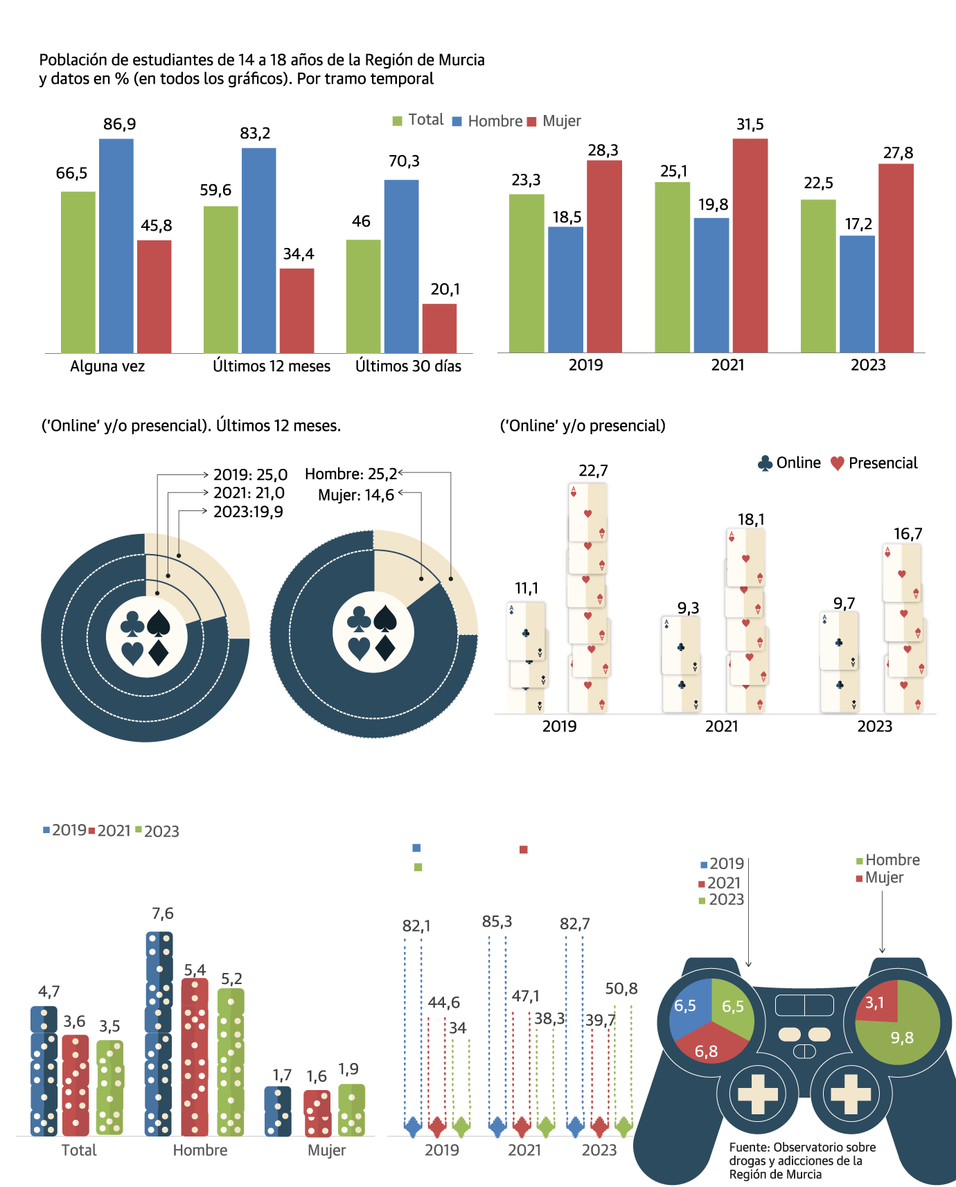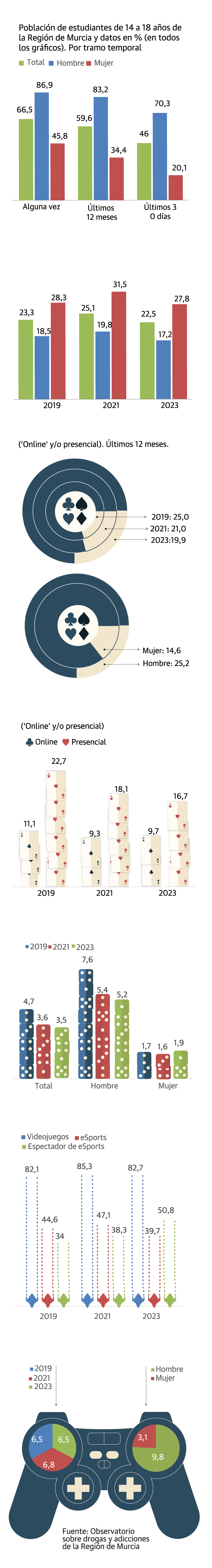 El estudio recoge otros datos llamativos: el 46% de los estudiantes murcianos de entre 14 y 18 años que presentan pautas de juego presencial problemático acuden a locales donde hay máquinas de azar o tragaperras, y el 45,6%, a establecimientos de apuestas deportivas. En el caso del juego ‘online’, las prácticas más problemáticas son también las apuestas deportivas, además de los videojuegos.