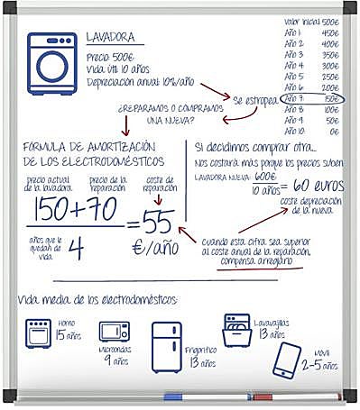 Cuando tengas dudas sobre si te compensa arreglar un electrodoméstico o comprar uno nuevo, aplica la fórmula de la amortización. «Imaginemos una lavadora: Al precio actual del aparato (150 euros), se le suma el de la reparación (70). El resultado (220) se divide entre el número de años de vida (4) que le quedan al electrodomético. Esa cifra (55) es la que debemos comparar con el resultado de dividir el precio de una lavadora nueva (600) entre los años de vida útil del aparato (10). Si el número resultante (60) es superior al de la primera operacaión (55) significa que no nos compensa comprar una lavadora nueva».