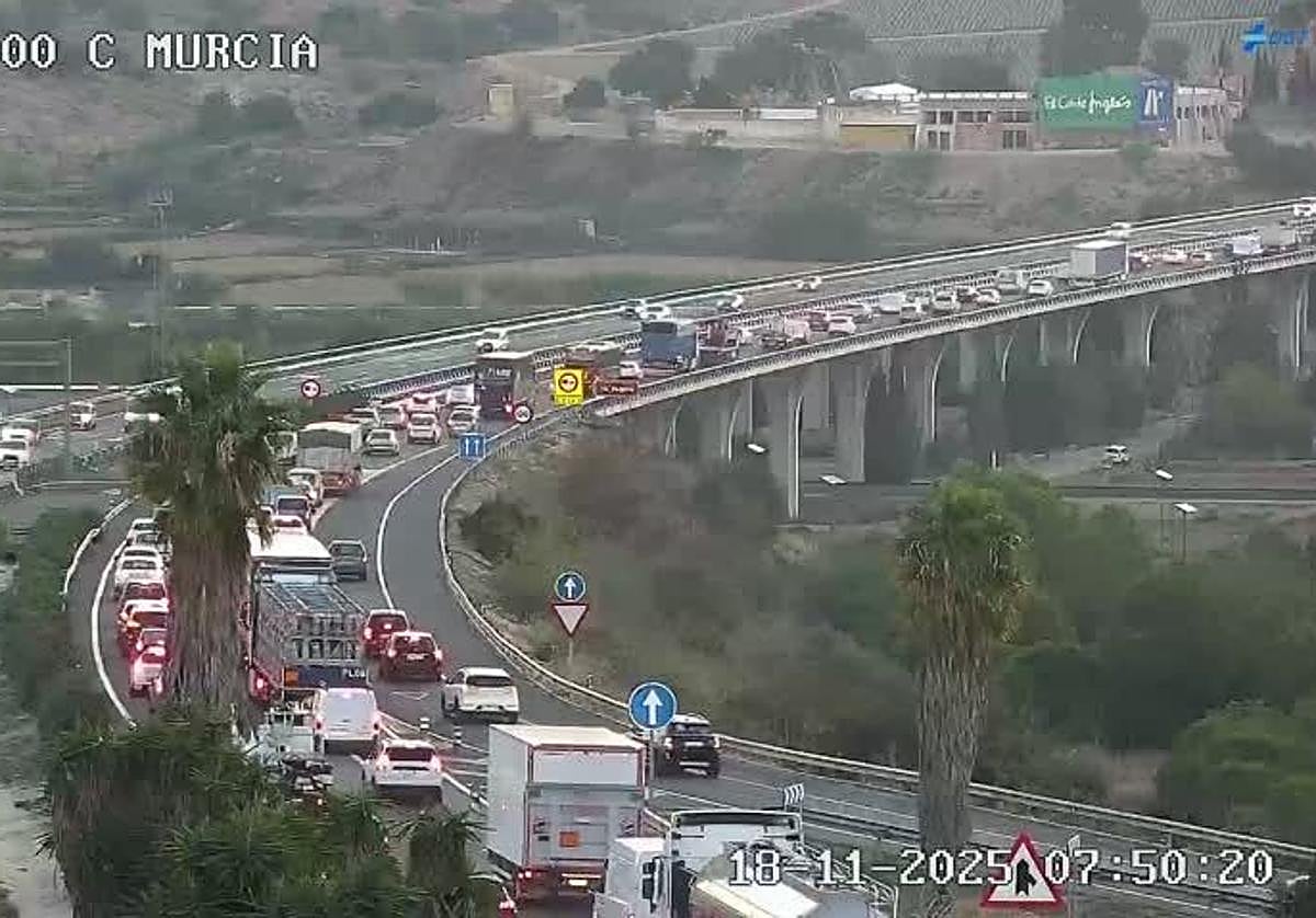 Por su parte, la autovía A-30 presentó poca fluidez a la altura de Molina de Segura, en dirección a la capital, y un accidente a la altura del Aeropuerto de la Región de Murcia ocasionó otros dos kilómetros de retenciones entre los puntos 164,68 y 166,75 de esa misma carretera, dificultando el viaje de Cartagena a la capital.