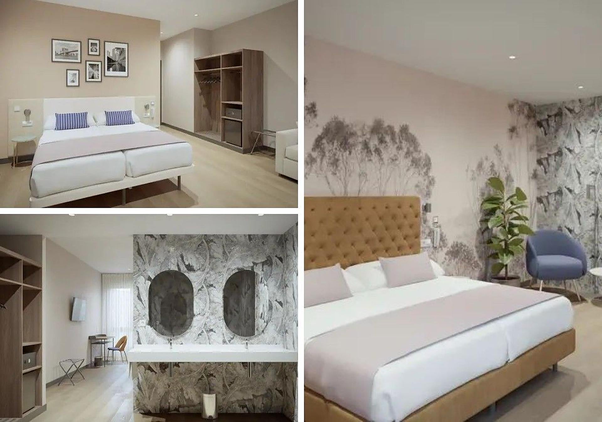 Dos habitaciones y uno de los baños que ofrece el hotel.