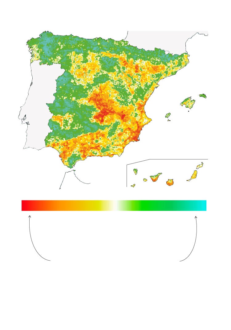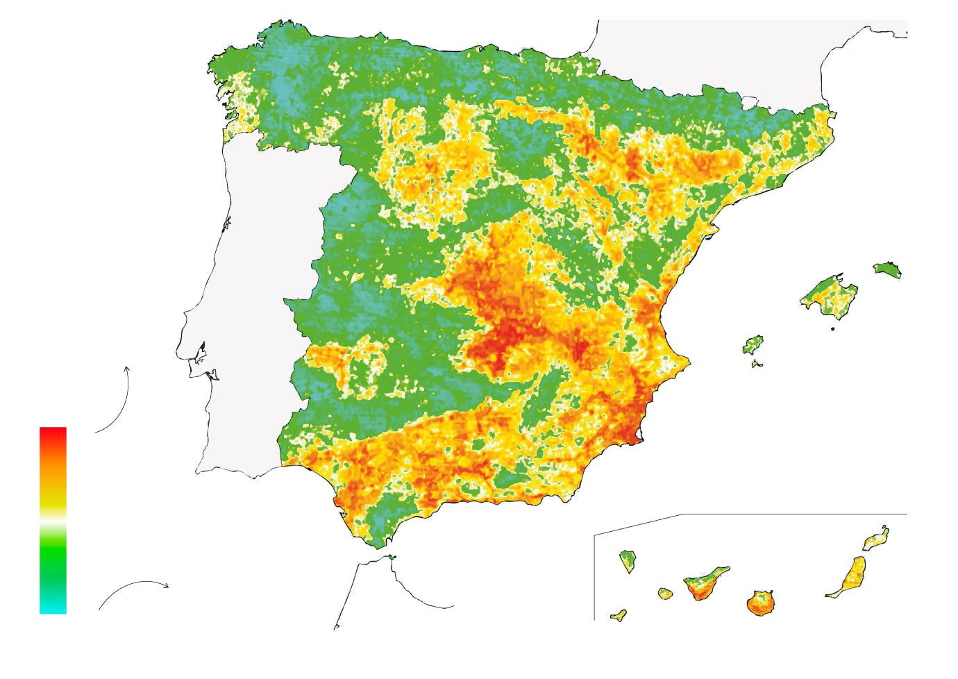 Región de Murcia, Comunidad Valenciana, Andalucía, Castilla-La Mancha, Aragón y Canarias son las comunidades autónomas más afectadas por este escenario de altas temperaturas, escasos recursos hídricos (no sólo por la falta de lluvias, también por la sobreexplotación de los acuíferos), que conduce a la pérdida de suelo útil para la biodiversidad y la agricultura. El estudio remarca que la Comunidad murciana, como «registra aridez en diferente grado», pero en toda su extensión, «resulta ser la que tiene un mayor porcentaje de superficie desertificada». A esto añaden que, «curiosamente», toda la superficie tiene «un índice de aridez inferior a 0,65, pero no cuenta con un solo kilómetro cuadrado de zonas estrictamente ‘áridas’».