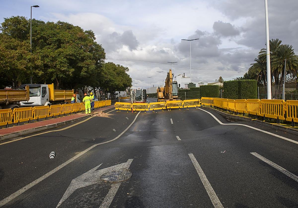 El tráfico se encuentra cortado en la zona afectada de la avenida Miguel Indurain, de norte a sur, entre rotonda Homenaje a los Poetas y rotonda de Avenida del Rocío, permitiendo únicamente el acceso a la gasolinera y zona industrial por la vía de servicio.