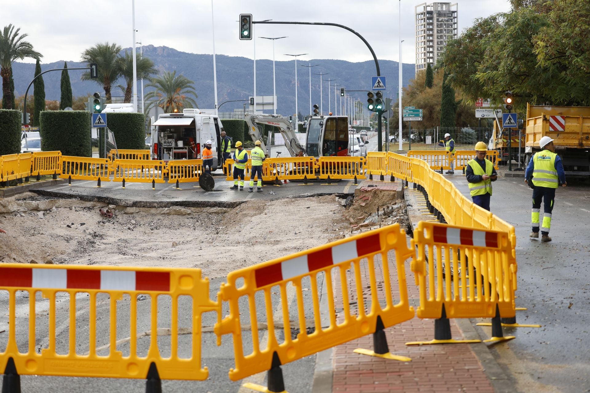 Técnicos de la empresa municipal Aguas de Murcia intentaban en la mañana de este lunes afinar el diagnóstico de un percance que se hace palpable en el metro y medio de desnivel que puede apreciarse en el enorme socavón que presenta, en estos momentos, una de las principales vías de circunvalación de la ciudad. Con la rotura asomando justo al inicio del fin de semana, era una incógnita el cómo se comportaría este lunes el tráfico de acceso al casco urbano, aunque podía suponerse que la situación, con el arranque de la semana laboral, no iba a ser precisamente cómoda para los conductores que suelen transitar la zona.