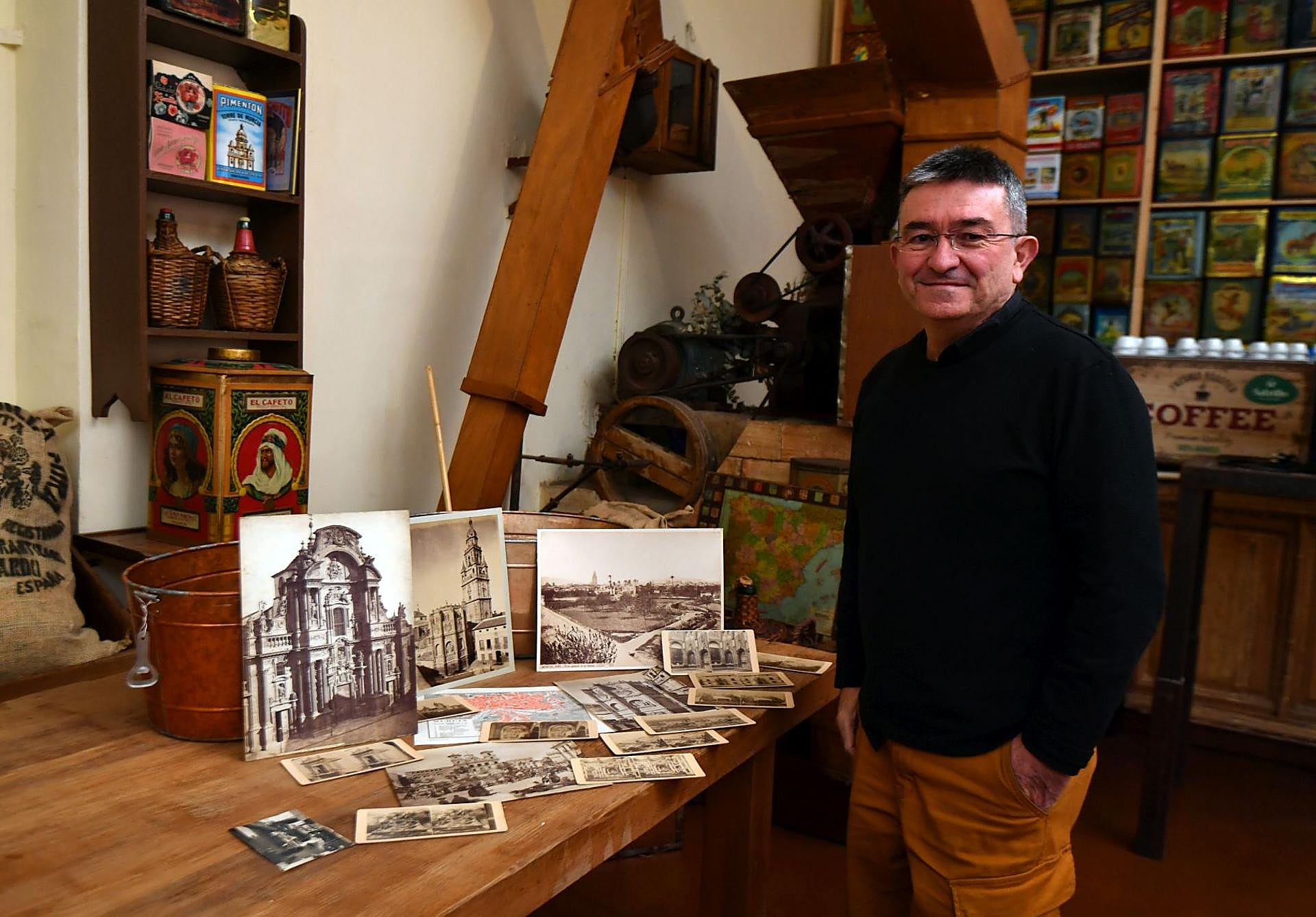 El arquitecto Paco Sola, en el molino Tonita, junto a ejemplares de las imágenes que ha ido adquiriendo en colecciones desperdigadas por Europa.