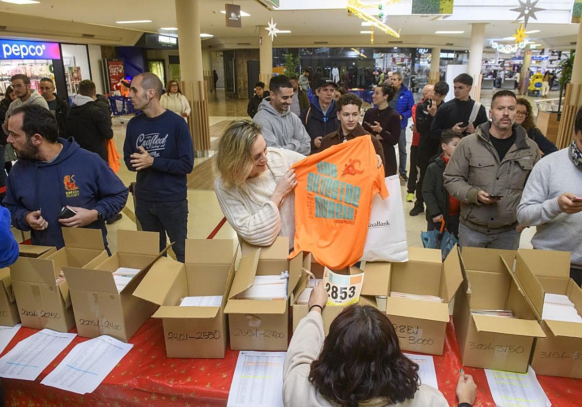 Pero eso será el miércoles, porque en la mañana del lunes el temporal todavía colea en un cielo plomizo sobre el Centro Comercial Atalayas. En su interior, al ritmo distendido que marcan las últimas compras para Reyes, los murcianos acuden a por el preparativo final. Solos, en pareja o en grupo, escanean el QR y salen con esa bolsa de CaixaBank que contiene las provisiones de Juver y Vidal, pero sobre todo ese dorsal y camiseta que reza ‘San Silvestre Murcia 2025’, una escena que se repite una y otra vez.
