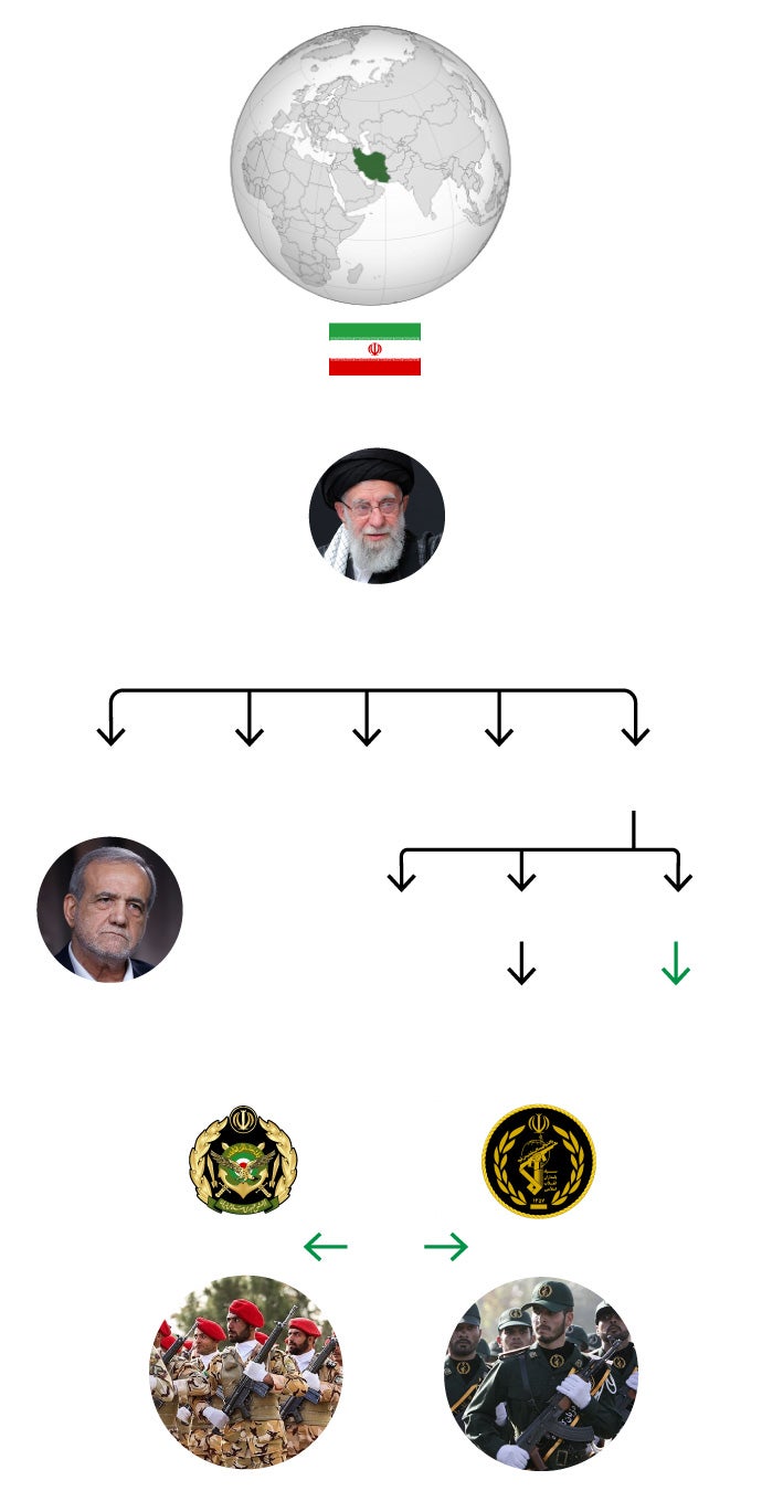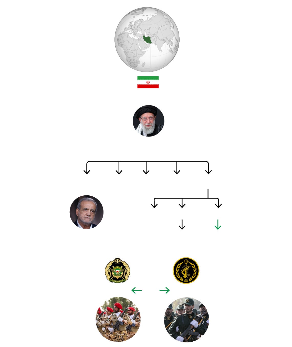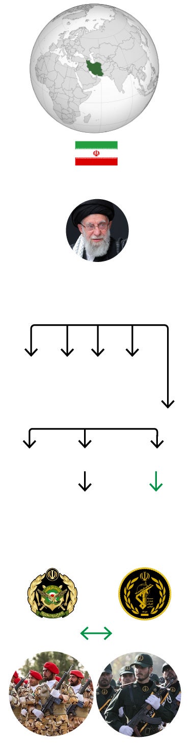 Poca broma con un ejército situado en la posición número catorce del ránking mundial, por encima de Israel (17), Francia, España o Alemania. Irán tiene un sistema militar complejo, más enrevesado que el de los países de su entorno, compuesto por lo que podría interpretarse como redes redundantes que le permiten combinar un ejército al uso con un aparato disciplinario para mantener el orden y un cuerpo militarizado de protección de sus líderes políticos y religiosos. Esta arquitectura basada en tres pilares le ha permitido al régimen de los ayatolás mantenerse en el poder contra viento y marea hasta ahora, que se ve cercado por manifestaciones populares sin parangón en la historia del país.