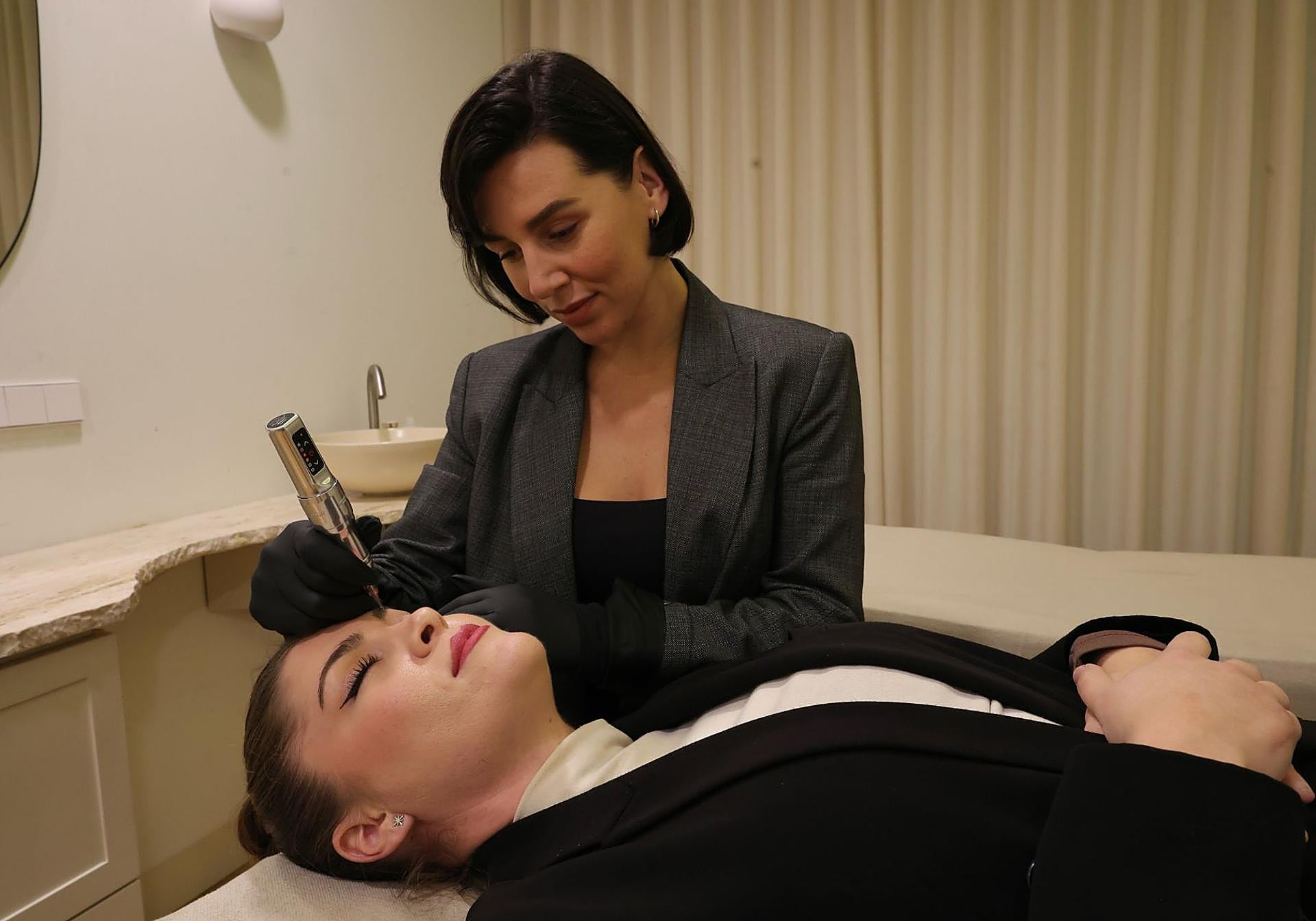 Sabrina Martinezova perfila las cejas de una joven en su centro estético en Murcia.