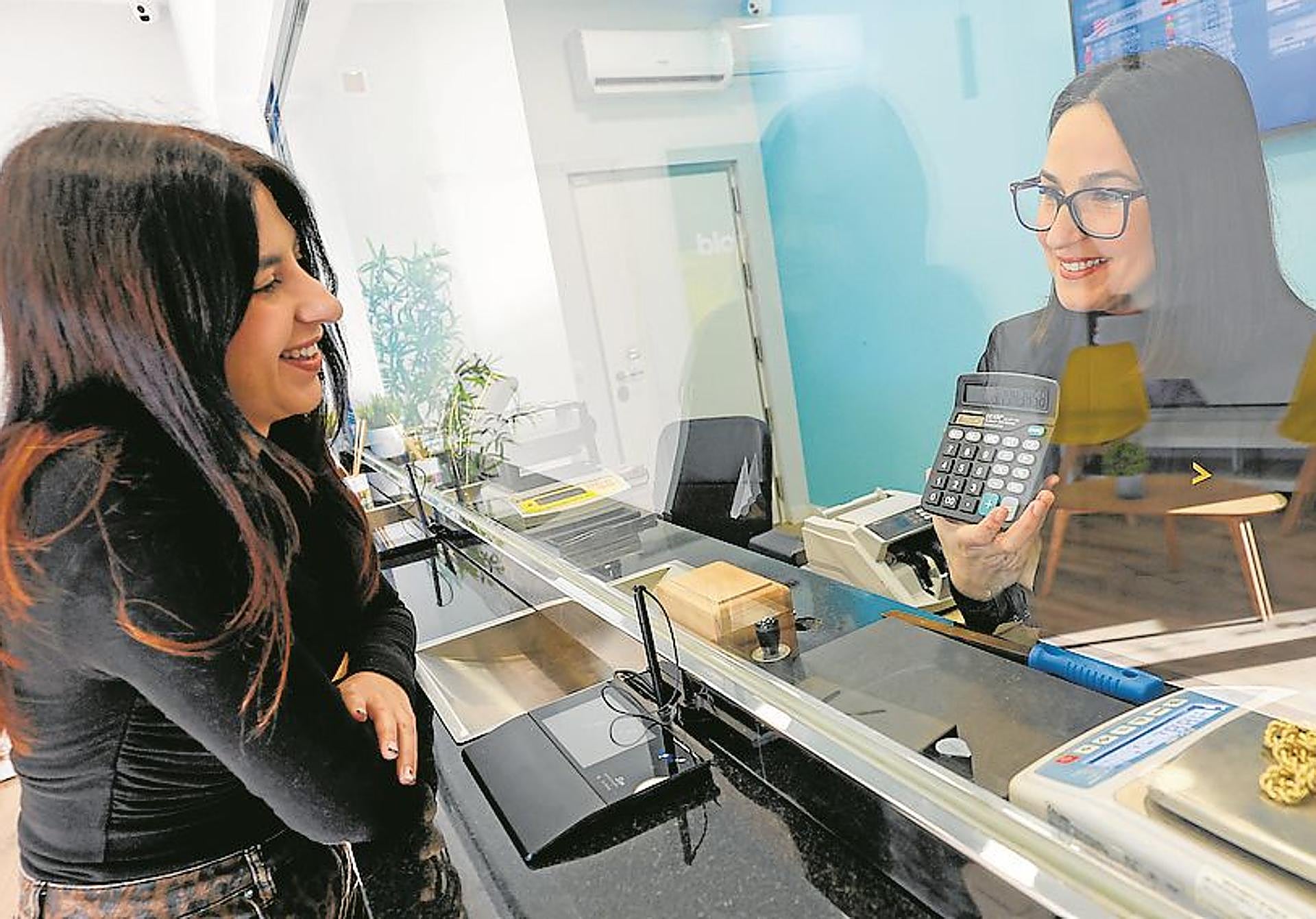 Lorena Hernández atiende a una clienta en la tienda de Quickgold en el barrio del Carmen de Murcia.