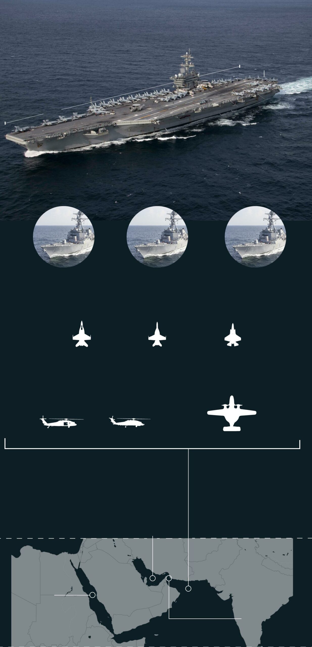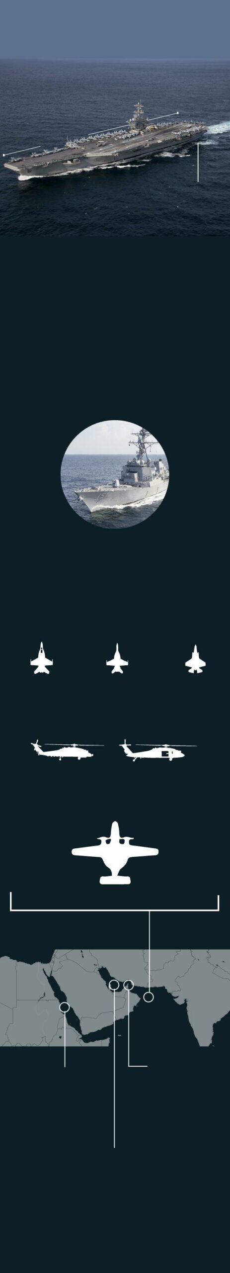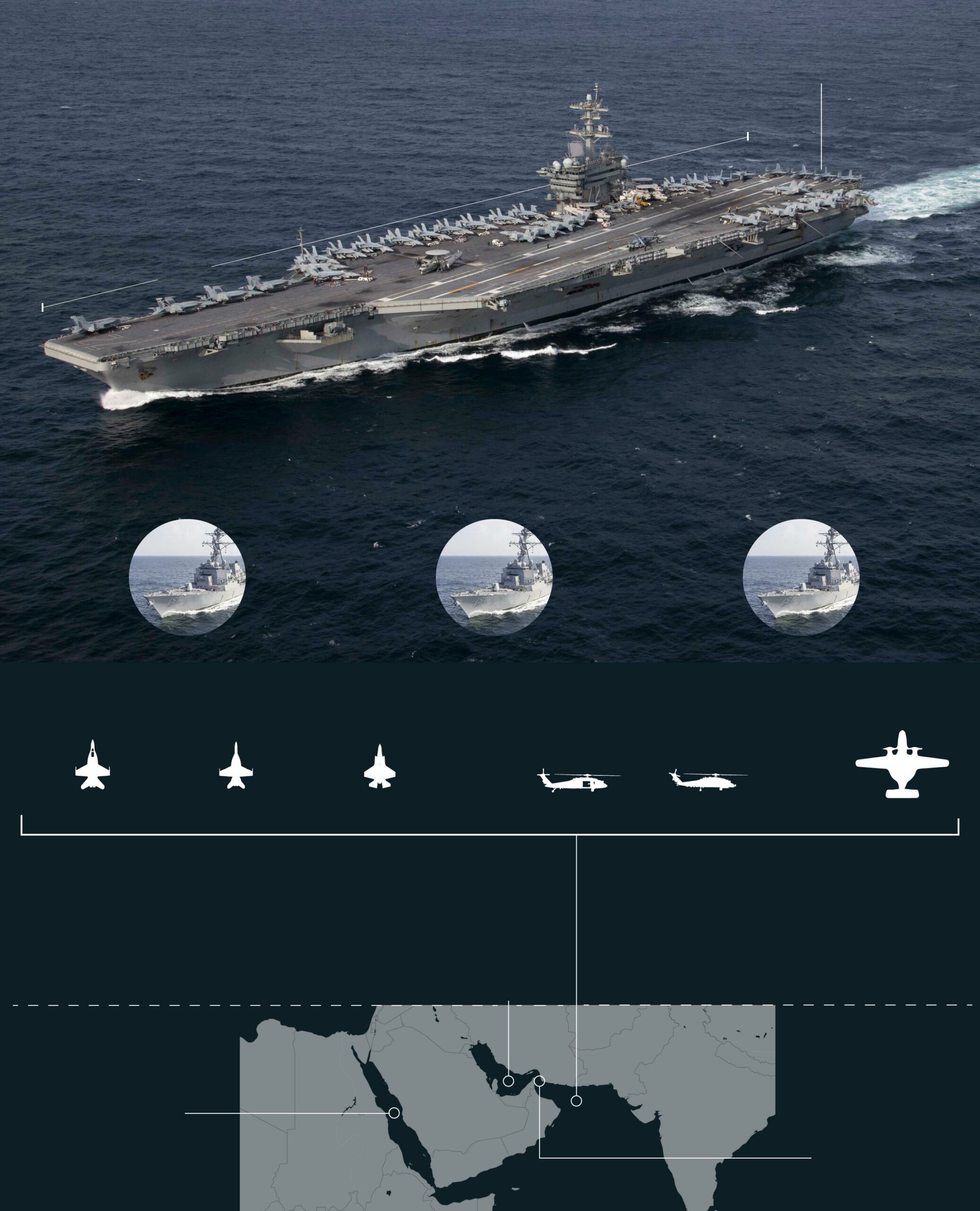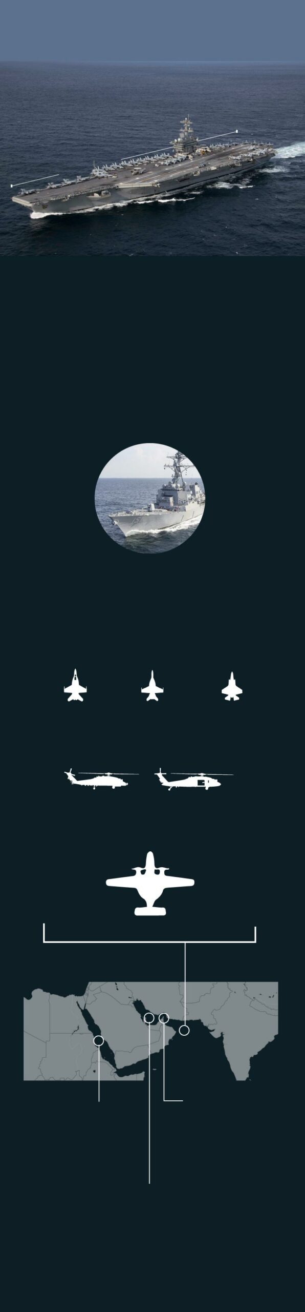 La fuerza naval pivota sobre el ‘Abraham Lincoln’, que ha sido transferido desde el mar de China Meridional. En función de los acontecimientos, EE UU podría enviar un segundo portaaviones, el ‘George W. Bush’, mucho más moderno, en los próximos meses. Los dos pertenecen a la clase Nimitz, los mayores buques de guerra que operan en el mundo. La flota de EE UU cuenta con diez.