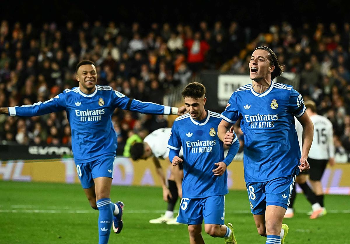 Para evitar más sobresaltos, el Real Madrid tomó el control del partido, a la espera de sentenciarlo con alguna carrera de Mbappé. En varias de sus galopadas, el delantero francés se vio perseguido por varios rivales, pero sin opciones claras de pase por delante. También ayudó la entrada en el equipo de Brahim, quien dotó de más orden en la posesión al equipo blanco en los metros finales. Mbappé rara vez se marcha sin marcar esta temporada, y Mestalla no fue la excepción. En los instantes finales, cuando parte de la afición valencianista abandonaba el estadio y la otra mostraba su descontento con Lim y Corberán con pañuelos, el delantero francés cerró el partido a boca de gol tras una asistencia de Brahim.