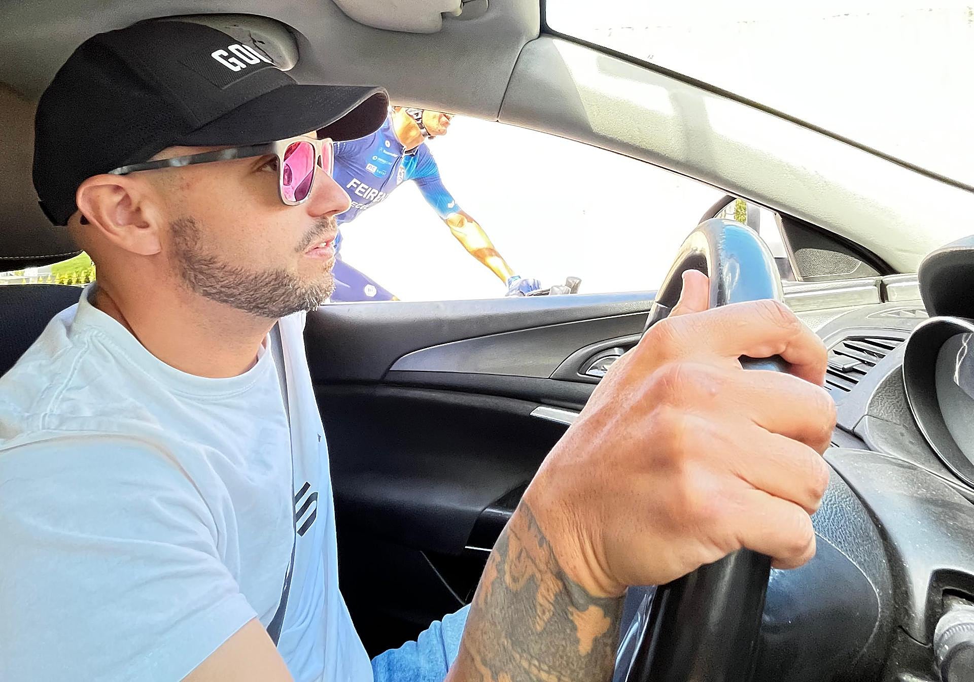 Juanmi Pérez suministra un bidón a un ciclista desde el coche del equipo.