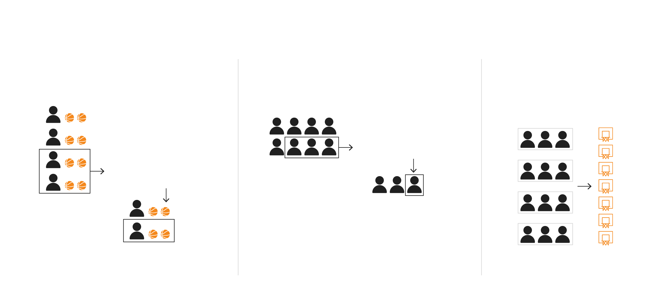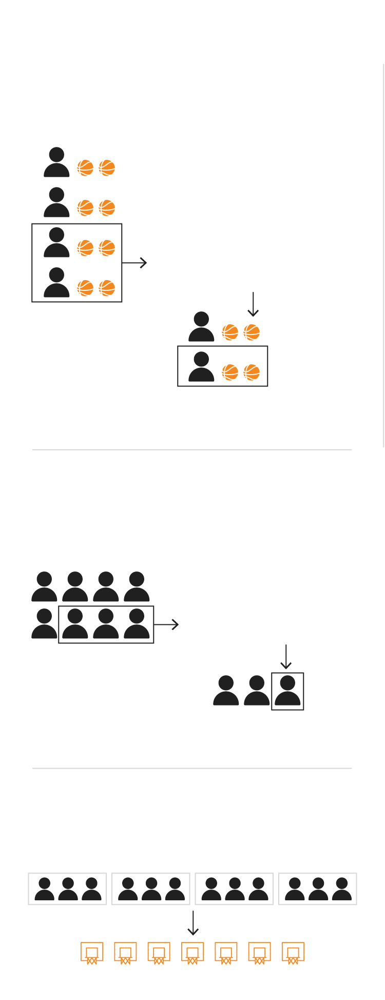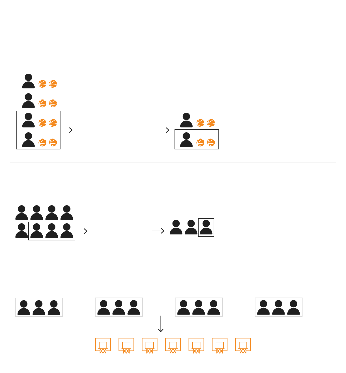 Cuatro equipos tienen que encestar en siete canastas desde ubicaciones distintas