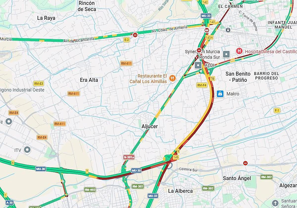Un accidente en la mañana de este martes en la autovía A-30, ahora denominada MU-33, a la altura de Murcia, complica la circulación y provoca retenciones. En concreto, a la altura de Aljucer y La Arboleja el atasco se extiende entre los kilómetros 9,4 y 5 en sentido Albacete. El siniestro deja también un estrechamiento de carriles. Además, también en sentido Cartagena el tráfico está congestionado entre los kilómetros 7,8 y 9.