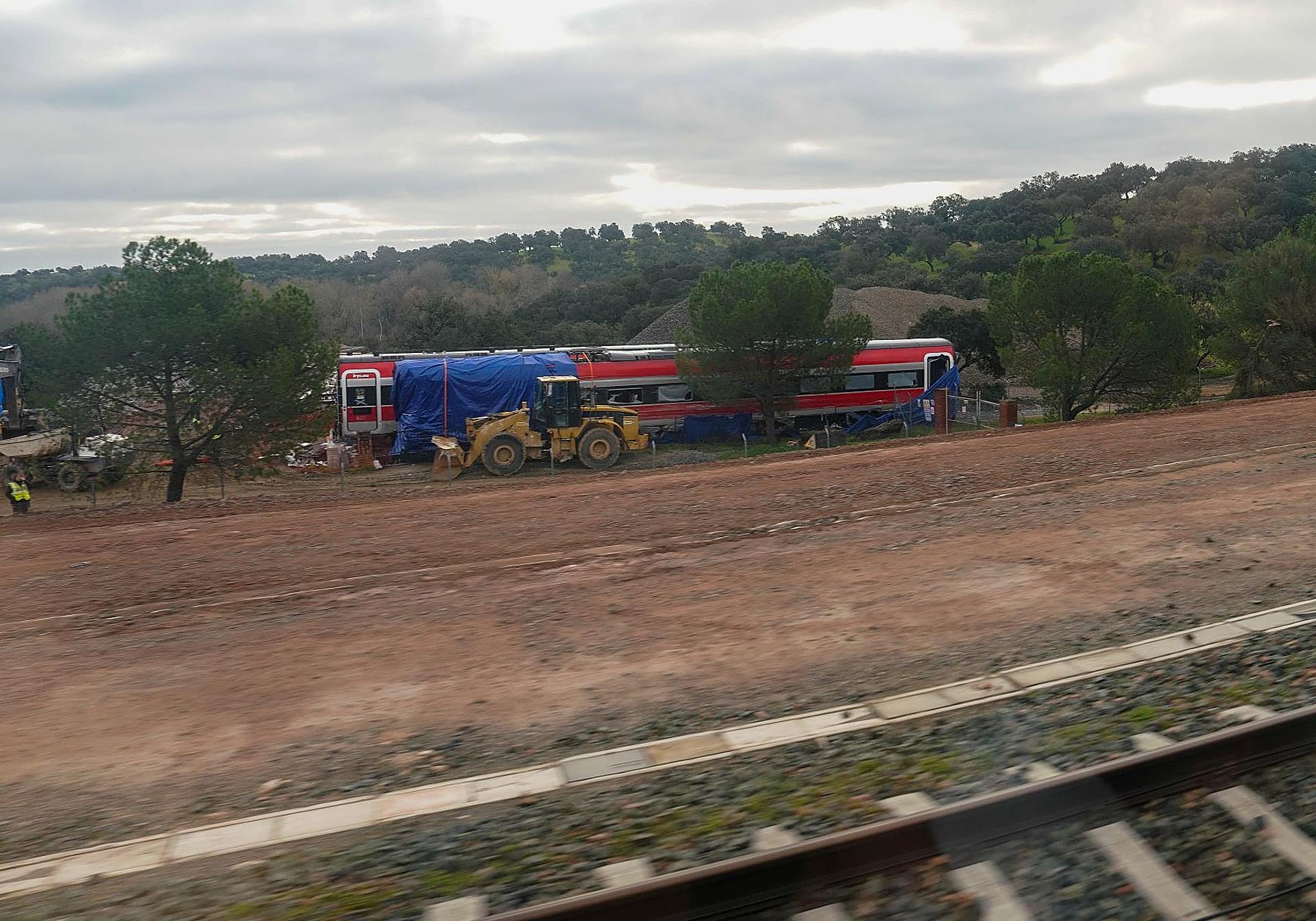 Justo en este instante, a las 9.15, el AVE pasa por Adamuz, y muchos viajeros pegan los ojos a la ventanilla tratando de localizar algún resto del accidente. Impresiona ver uno de los vagones rojos del Iryo siniestrado, aún varado sobre una vía secundaria. También hay restos de lo que parece una rodadura, maquinaria pesada y algunos operarios yendo de un lado para otro.