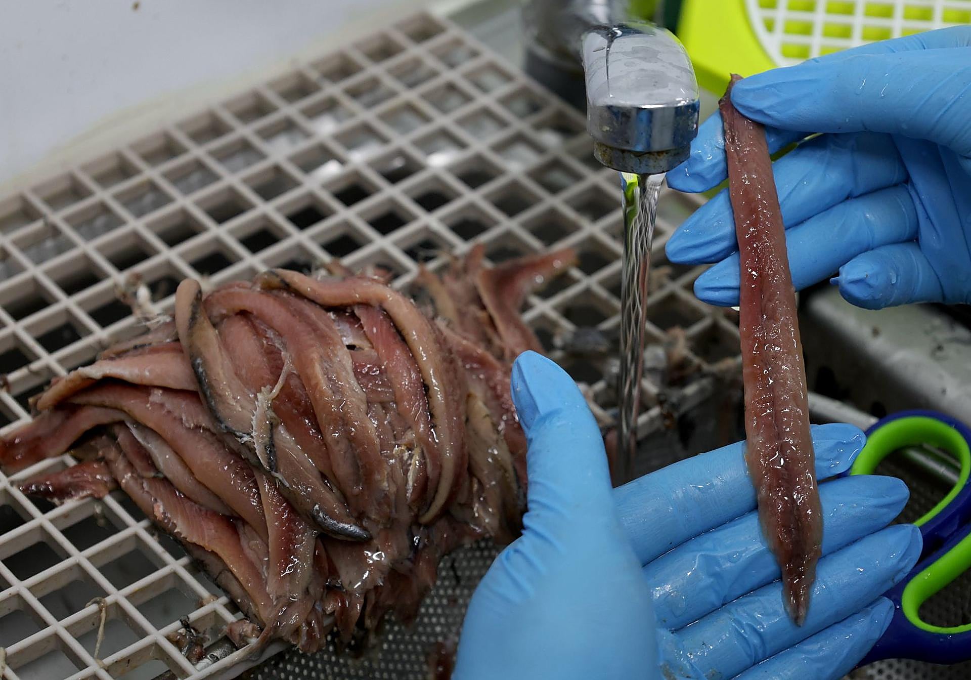 El producto viene en barriles de 250 kilogramos de un proveedor de Santoña. Aquí, en la fábrica de Molina de Segura, las trabajadoras limpian las anchoas debajo del grifo para dejar los filetes listos. «La diferencia con el método que se emplea en el norte -explica Ballester- es que allí primero se escalda la anchoa, que es como meterla en agua. La dejan reposando en agua, digamos, y luego la limpian a mano, que eso se hace igual aquí, aunque luego cada uno tenga su destreza. Lo que sí hacen ellos después es centrifugarla; es decir, sacarle toda la humedad. Por eso la anchoa del norte suele tener un año de caducidad y suele ser una anchoa un poco más dura, un poco más tiesa. Pero también está buenísima. Y las nuestras salen un poco más blanditas, más suave de sal, y tal».