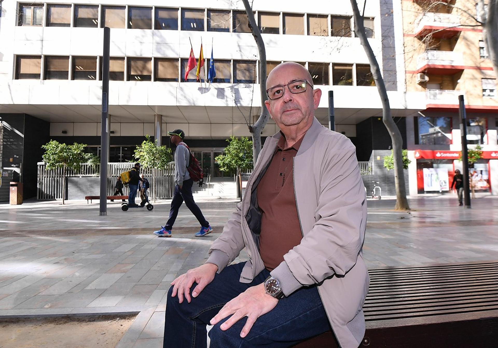 Javier Aguilar, incapacitado por un accidente de trabajo, sentado enfrente del Instituto Nacional de la Seguridad Social, en Murcia.