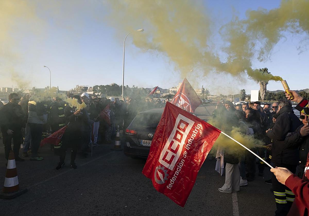 Durante la mañana de este martes, los trabajadores ya estaban convocados a la entrada de Sabic para ofrecer un ‘caluroso’ recibimiento a los enviados del fondo de inversión alemán. Los sindicatos les aguardaban en el acceso principal al complejo equipados con sus banderas y pancartas.