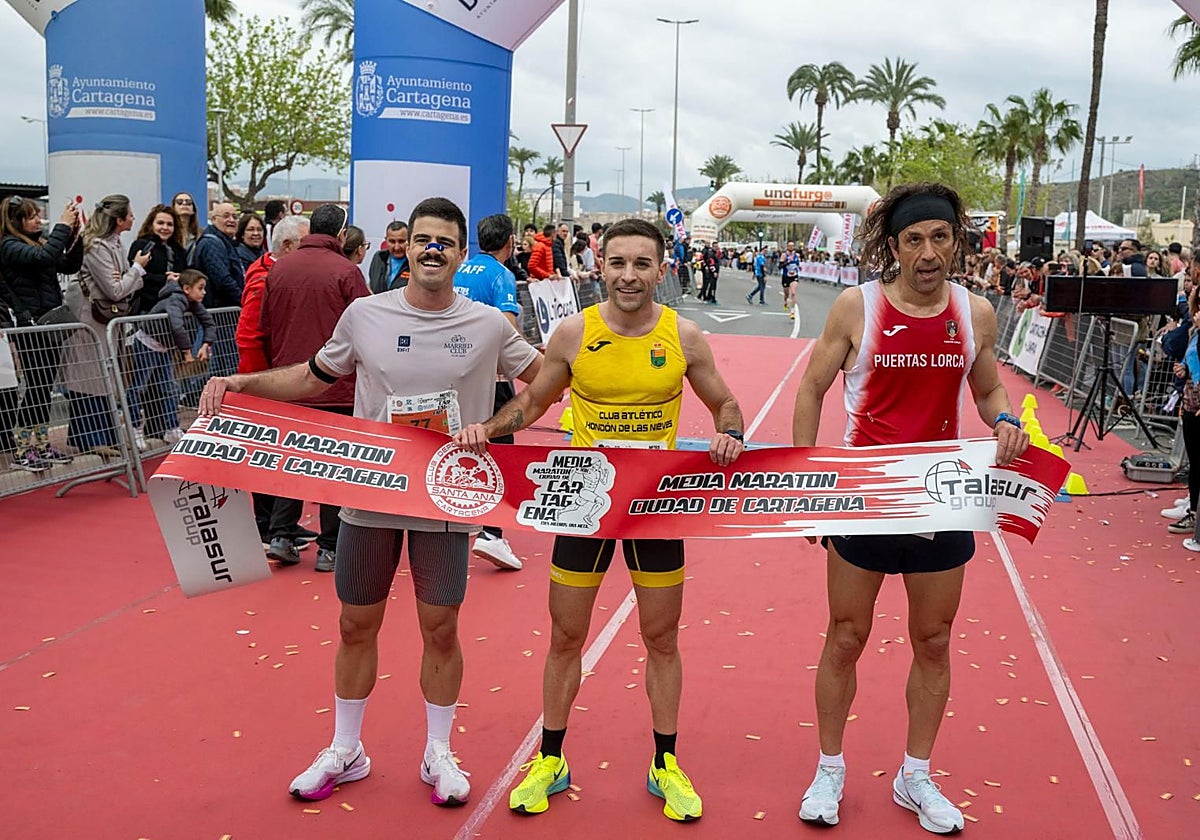 La profesora de Maristas sigue dando guerra en cada gran cita. A sus espaldas tiene ya numerosas victorias en la Ruta de las Fortalezas y hazañas como la de completar grandes maratones del mundo como la de Berlín. Siempre sonriente y orgullosa, Velasco paró el crono en 01.24.41 y superó a la ganadora del año pasado y compañera del Runtritón: Llanos García (01.27.22). El lorquino Mario Molina (01:11:52), recién acabado su turno de noche en el Hospital Santa Lucía, dio un enorme acelerón para superar a un confiado José Manuel Martínez (01:11:55) para quedar segundo en el cuadro masculino. Todos los ganadores mostraron su agradecimiento al público que los animó por toda la ciudad y especialmente a lo largo de la avenida del Cantón.