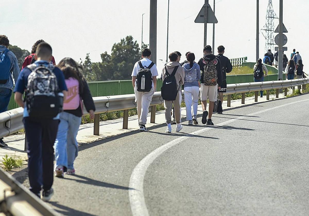 Pasan las dos de la tarde cuando los alumnos y alumnas del IES José Planes salen en tromba de clase. A esa misma hora, la … circulación de vehículos de regreso del trabajo a casa para comer también se nota, sobre todo en una vía tan transitada entre Espinardo y Guadalupe como la avenida de Los Jerónimos. Muchos de estos jóvenes usan el viaducto sobre la Ronda Oeste, la MU-33, para volver a pie, no solo a Guadalupe, sino también a otros puntos como La Ñora o Javalí Viejo. Daniel y Mario, de 17 años y estudiantes de Bachillerato son dos de ellos: «Hay poco espacio para los peatones y nos tenemos que salir al arcén». «Es muy estrecho y peligroso, los coches vienen muy rápido».