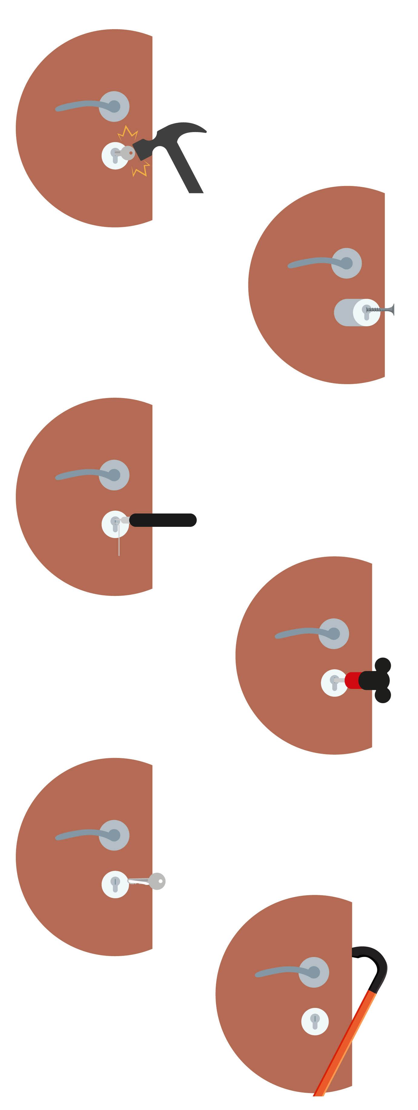El ladrón gira un tornillo en el ojo de la cerradura, que permite extraer todo el cilindro. Con una herramienta especial de extracción de llaves o incluso simplemente con un martillo de uña convencional, el cilindro se extrae de la cerradura.