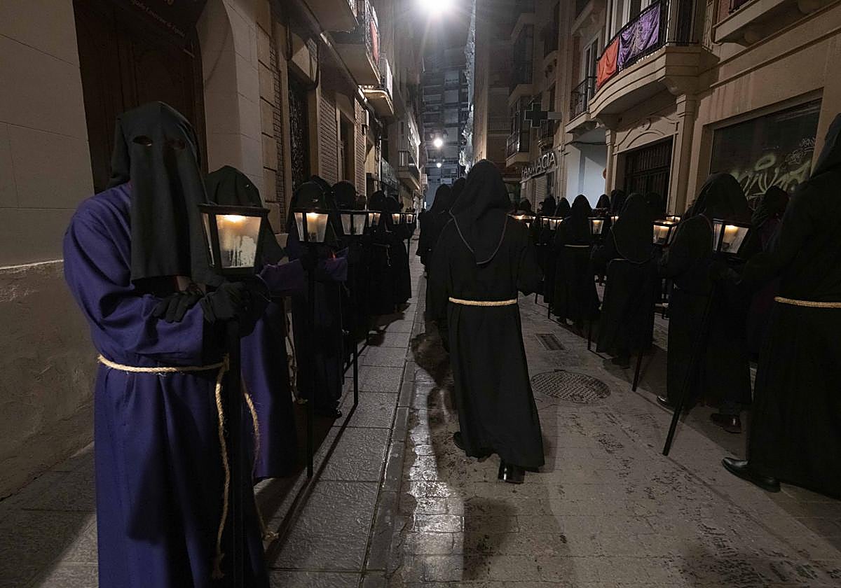El silencio, las túnicas sencillas en negro y morado, la luz de las velas, el redoble de un par de tambores con sordina y el rezo de las estaciones del vía crucis marcarán el discurrir de los tronos de la Virgen de la Soledad del Consuelo y de su hijo crucificado por las calles más castizas del centro histórico. A diferencia de lo que ocurre en el resto de procesiones cartageneras, en este vía crucis se invierte el orden de los tronos y sólo el de la Virgen María adelanta al de Jesús en el momento final, el de la despedida, para entonar la salve hacia las ocho de la mañana.
