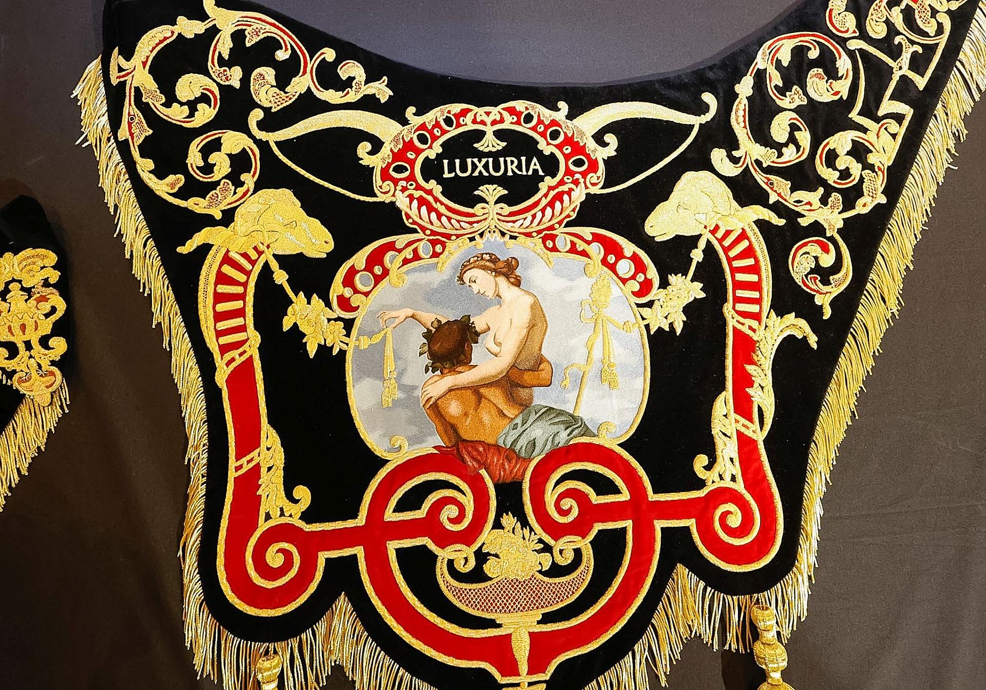 Estas referencias se encuentran en detalles como las águilas que protagonizan el manto de la envidia, asociado al color blanco; la singular técnica de la veladura con oro empleada en el manto de la ira (granate); la presencia de motivos centrales realizados en canutillo de oro o plata matizado en seda (mantos de la avaricia y la pereza, dorado y verde, respectivamente); la combinación del oro y la seda en los motivos centrales de los mantos (mantos de la gula y la soberbia, anaranjado y morado, respectivamente), y, por último, la incorporación de una escena figurativa en sedas matizadas, presente en el manto de la lujuria, la cual fue una de las aportaciones decisivas de Cayuela y del Paso Azul al desarrollo del bordado lorquino y del concepto de procesión que hace célebre a la Semana Santa de Lorca.