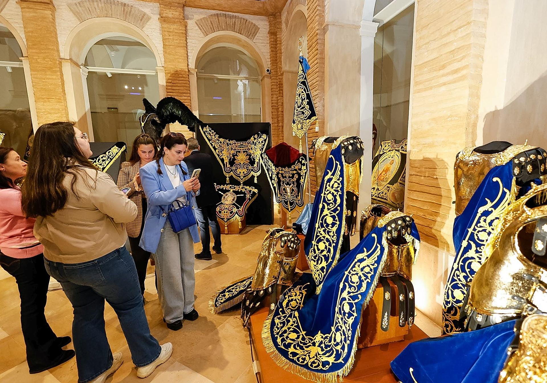 Además, se han bordado en los talleres del Paso Azul doce nuevos mantos de la infantería romana de la Legión VII, en canutillo de oro sobre terciopelo e inspirados en la estética de la Roma imperial. El nuevo banderín de la Agrupación Musical Mater Dolorosa incorpora ornamentación simbólica vinculada a la identidad del Paso Azul y se han bordado también once tocados para los maromeros de la Reina Meiamén del Domingo de Ramos y tres trajes de egipcia, estos en el taller de la Asociación Nuestra Señora de los Dolores.