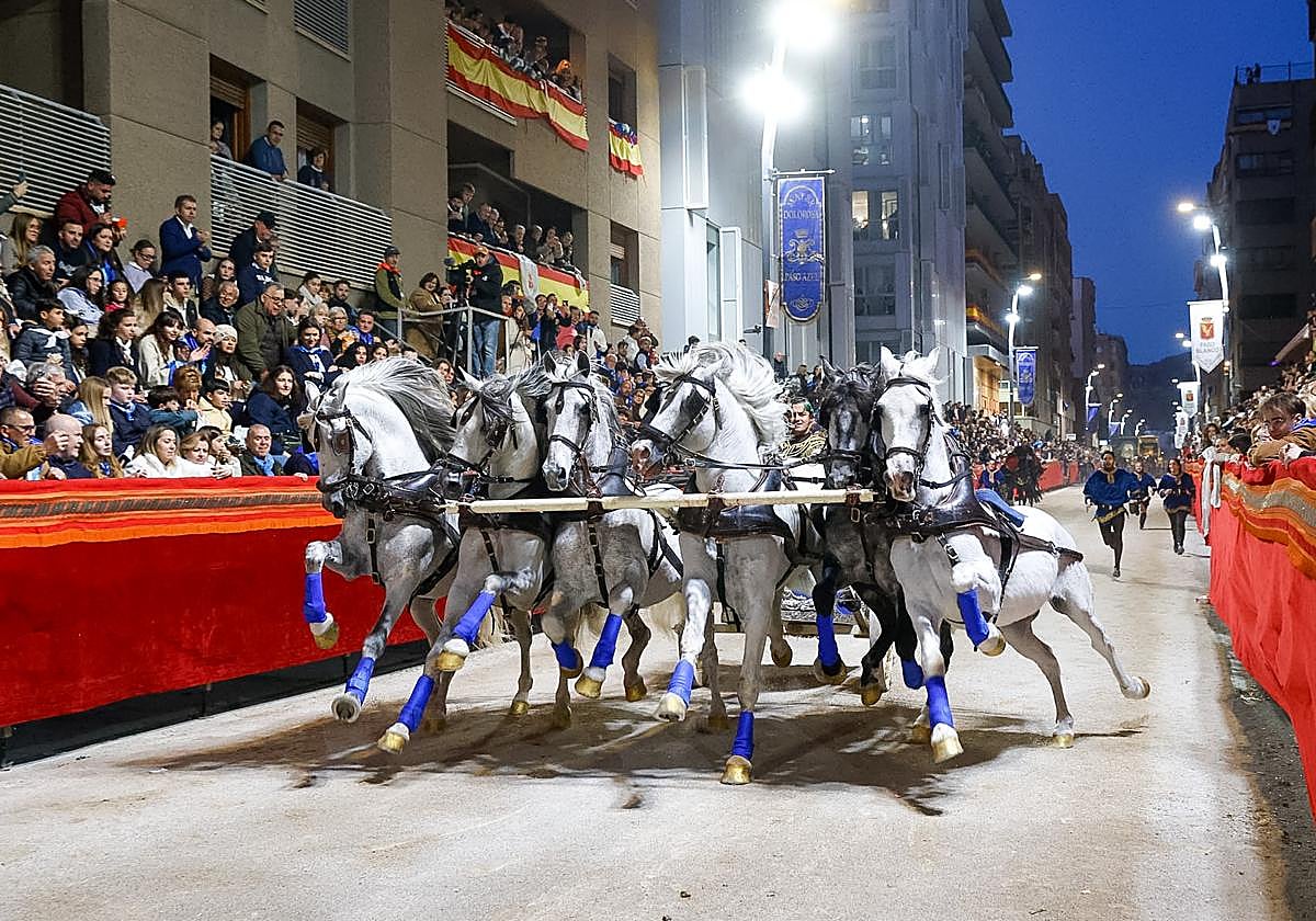 El Paso Blanco también desplegó sus cuadrigas, tres de ellas de la civilización asirio babilónica y otras tres del grupo de la reina de Saba. Tras la carroza de Nabuconodosor, rey de Babilonia que representa la deportación y el exilio del pueblo de Israel en Mesopotamia, desfilaron los primeros carros arrastrados por cuatro caballos, los de Judit, Holofernes y Aquior. A estos le siguieron los del faraón Siamón, hijo ilegítimo de Salomón y la reina de Saba, Nahama y Manelik. Las bigas de los reyes Ester y Asuero, que circulan en paralelo durante todo el desfile, mostraron la fastuosidad de la pareja real persa.