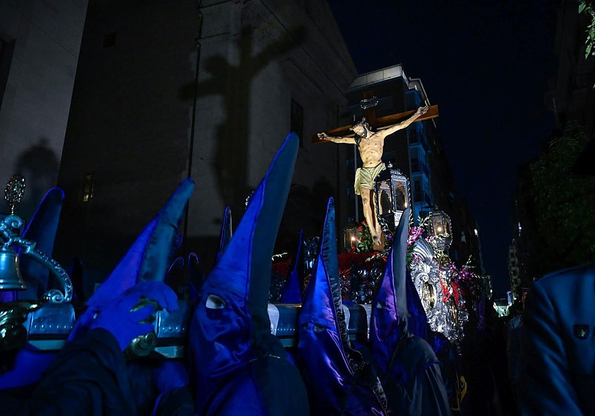 Apagadas las luces del centro de la urbe, como si Murcia quisiera esconderse para llorar a solas, avanza el cortejo hacia la plaza de Belluga entre un recogimiento que sobrecoge. Solo el retintín metálico de la campana, con su mango de madera desgastado por el pulso de los años, ordena la marcha de unos estantes que se hacen custodios del Señor por el rigor de la fe.