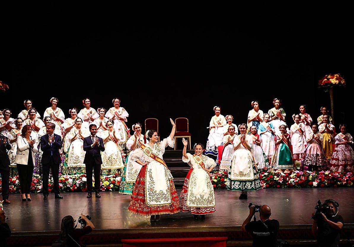 Protagonismo absoluto para las nuevas reinas en la Gala de Exaltación Huertana, con la que se lanzaron ayer unas Fiestas de Primavera de Murcia muy … especiales: las del 175 aniversario del Bando. Si bien lo habitual es dejar para el final de este acto la coronación de las recién elegidas representantes de la huerta, en esta ocasión la imposición del tocado de azahar tuvo lugar cuando apenas acababa de arrancar la cita. Una vez se produjo la cesión de las coronas por parte de las reinas salientes, Alba Franco y Alejandra Belmonte, las nuevas monarcas huertanas, Ángela Muñoz Briones -Mayor y de la peña El Botijo- y Leonor Antón Pons -Infantil y de Las Tenajas-, se acomodaron en sus tronos, instalados en el escenario, para presidir, junto a sus Cortes de Honor, todo aquello que se fue sucediendo sobre las tablas del Teatro Romea.