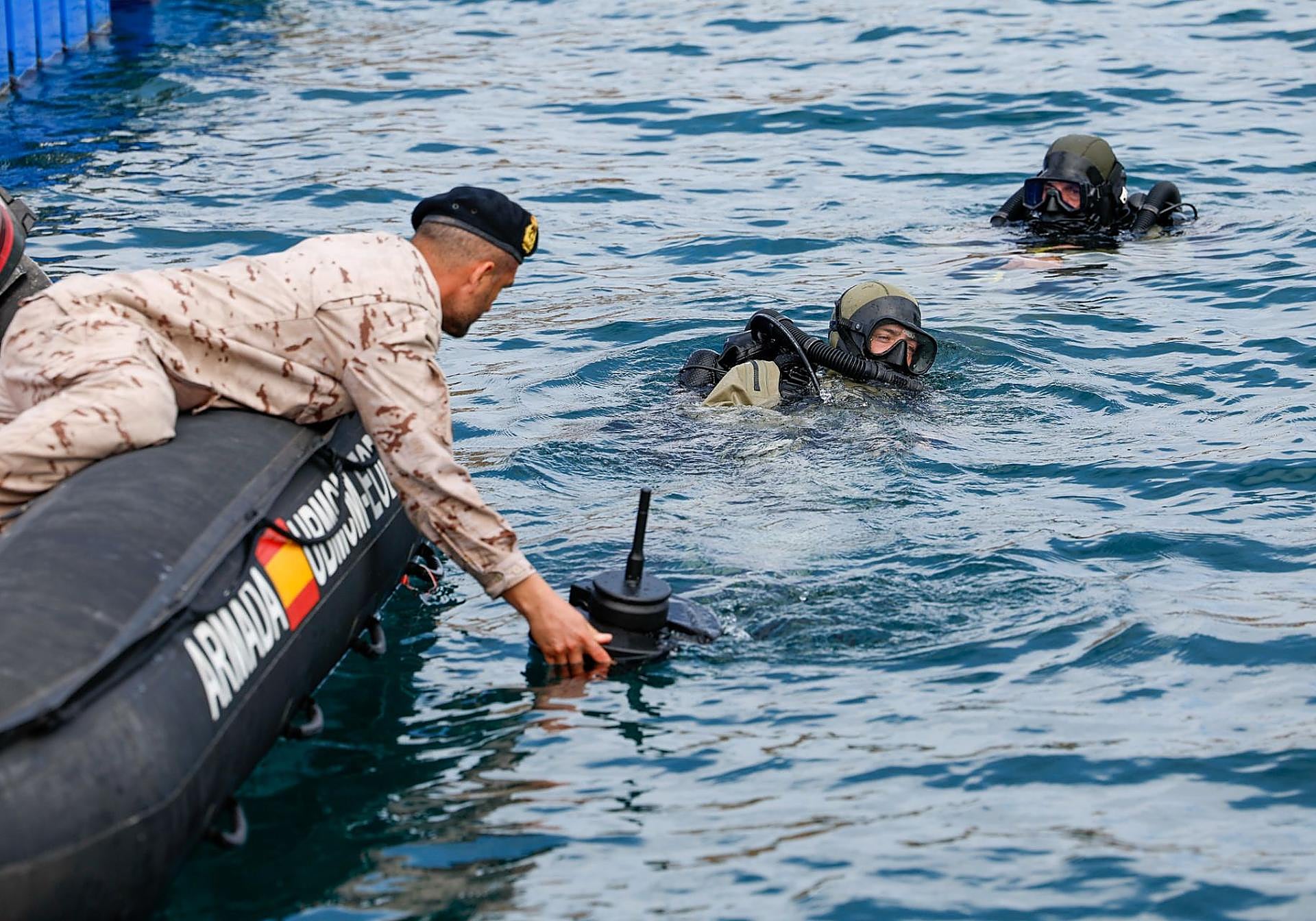 Acompañada del jefe de Estado Mayor de la Armada, almirante general Antonio Piñeiro, la titular de Defensa tuvo la posibilidad de asistir en el puerto de la Estación Naval de La Algameca a una demostración, tanto de activación de buceadores como de uso de material submarino con sonar y manejado desde la superficie para la detección de artefactos y minimizar riesgos sobre el personal.