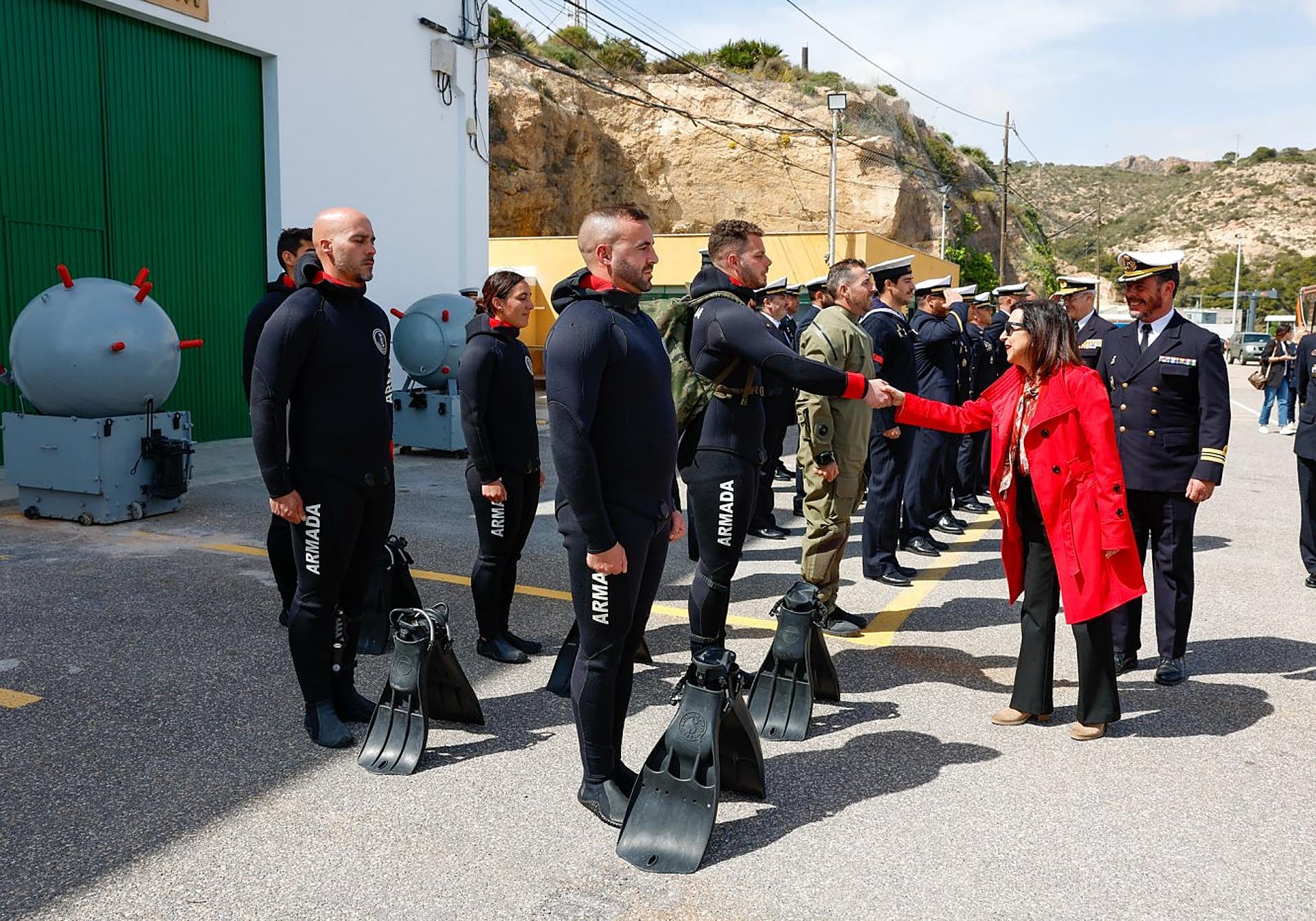 La ministra de Defensa saluda al personal de la Unidad de Buceo de la Fuerza de Medidas Contra Minas en el muelle de La Algameca.